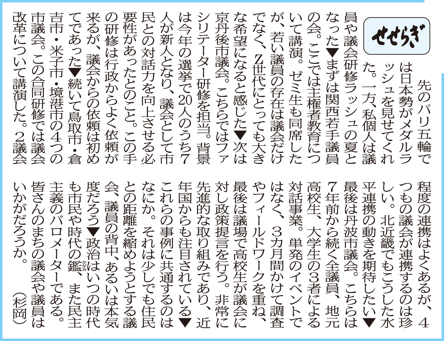 北近畿経済新聞「せせらぎ」に杉岡准教授が寄稿しました レポート 2024.08.21 北近畿経済新聞「せせらぎ」(2024年8月21日付け)に地域経営学部・杉岡秀紀准教授が寄稿しました。 (北近畿経済新聞社提供) 前回の記事はこちら ツイート