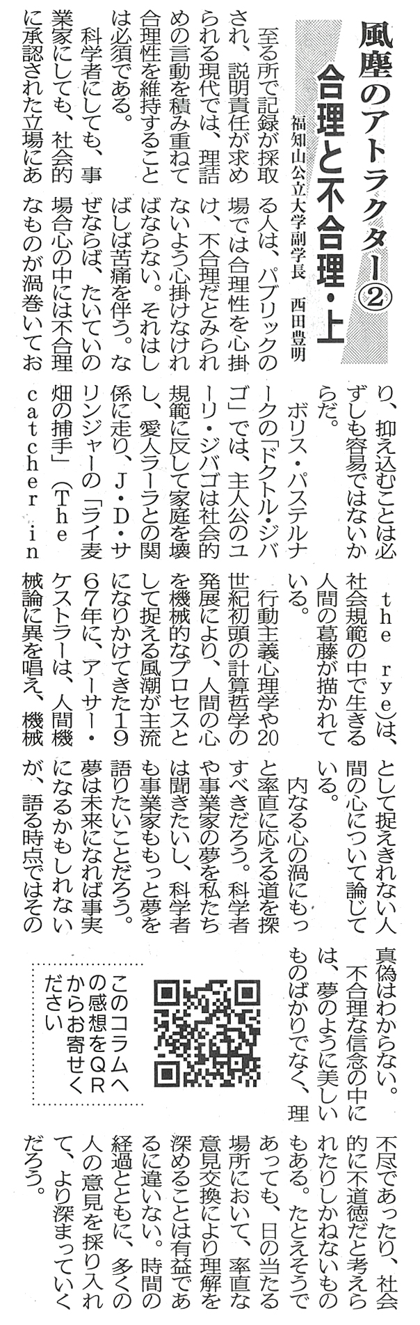 両丹日日新聞に西田副学長のコラムが掲載されました レポート 2024.08.22 両丹日日新聞(2024年8月21日付)に西田副学長が寄稿したコラム「風塵のアトラクター②合理と不合理・上」が掲載されました。 (両丹日日新聞社提供・無断複製及び転載を禁じます) 前回の記事はこちら ツイート