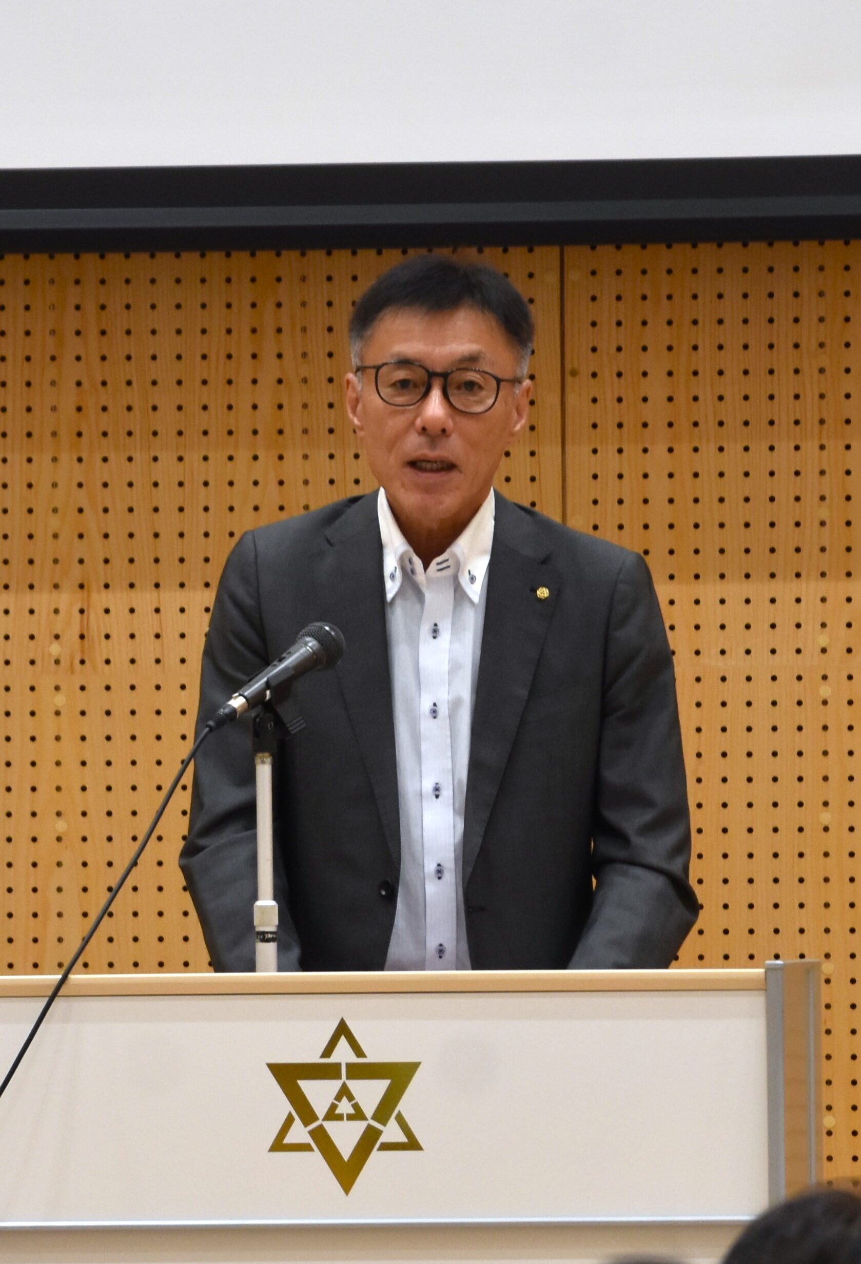 はじめに、川添信介学長が開会の挨拶で、 「地域情報学研究科は京都府北部で最初に開設された、極めてユニーク、そしてチャレンジングな性格を持つ大学院であると言える。地域情報学研究科の開設は、地域社会の発展に寄与することを中心的な目標とすることを明確にしている点が最大の特徴であり、そもそも誰のため・何のために学術や研究はあるのか、という問いに対するチャレンジングな答えと捉えることができ、本フォーラムのテーマにしている。学部と大学院が連携し、これまで以上に北近畿地域の現実的な社会課題や教育研究の充実を図り、地域課題に取組む人材を輩出していきたい」と述べました。