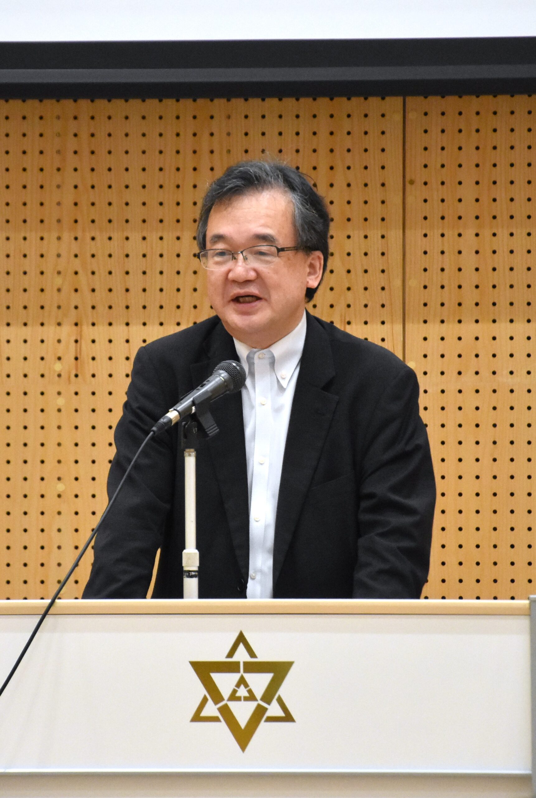 続いて、福知山市長の大橋一夫氏(代読:副市長 渡邊尚生氏)から、「地域創生の先端事例となる福知山モデルの実現において、大学院は無くてはならない存在である。地域企業との共同研究によるイノベーションの創出をはじめ、教育・福祉・防災・農業・観光など様々な分野で情報学が活用され、実践的な研究プロジェクトが課題解決をめざすものと大いに期待している」とお祝いの言葉をいただきました。