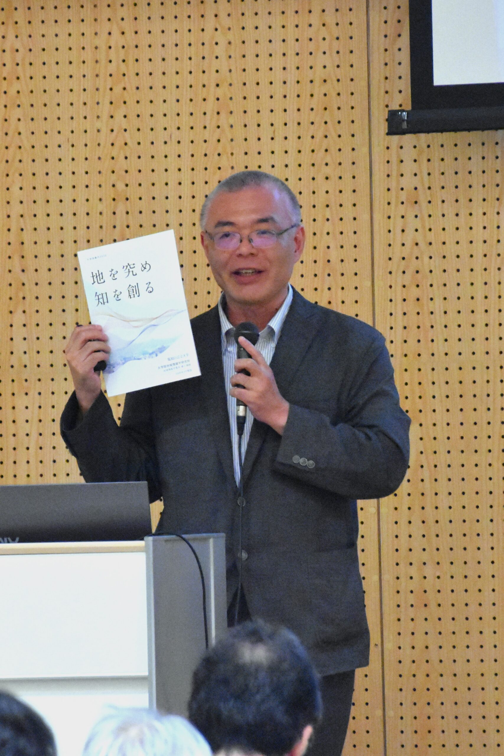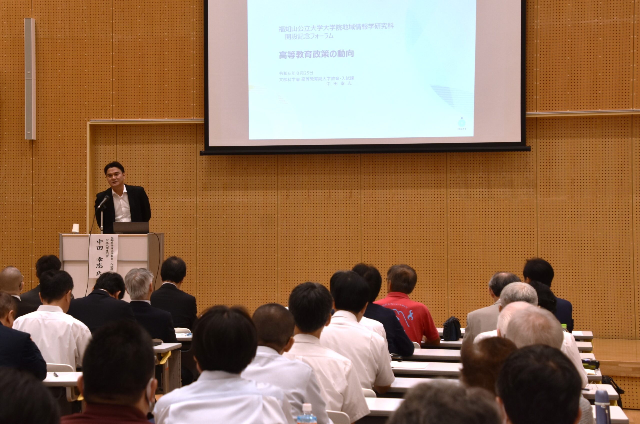 来賓である元文部科学省事務次官の義本博司氏からは、フォーラム前に福知山公立大学のキャンパスを見学したことにも触れられ、「旧校舎を引き継いでスタートした公立大学であったが、今日に至るまで発展し、環境を整えられていることに感銘した。大学は地域課題を解決するハブとしての役割が高まっているが、それを福知山モデルとして実行することが福知山公立大学の新しいミッションになるだろう」とお祝いのお言葉をいただきました。