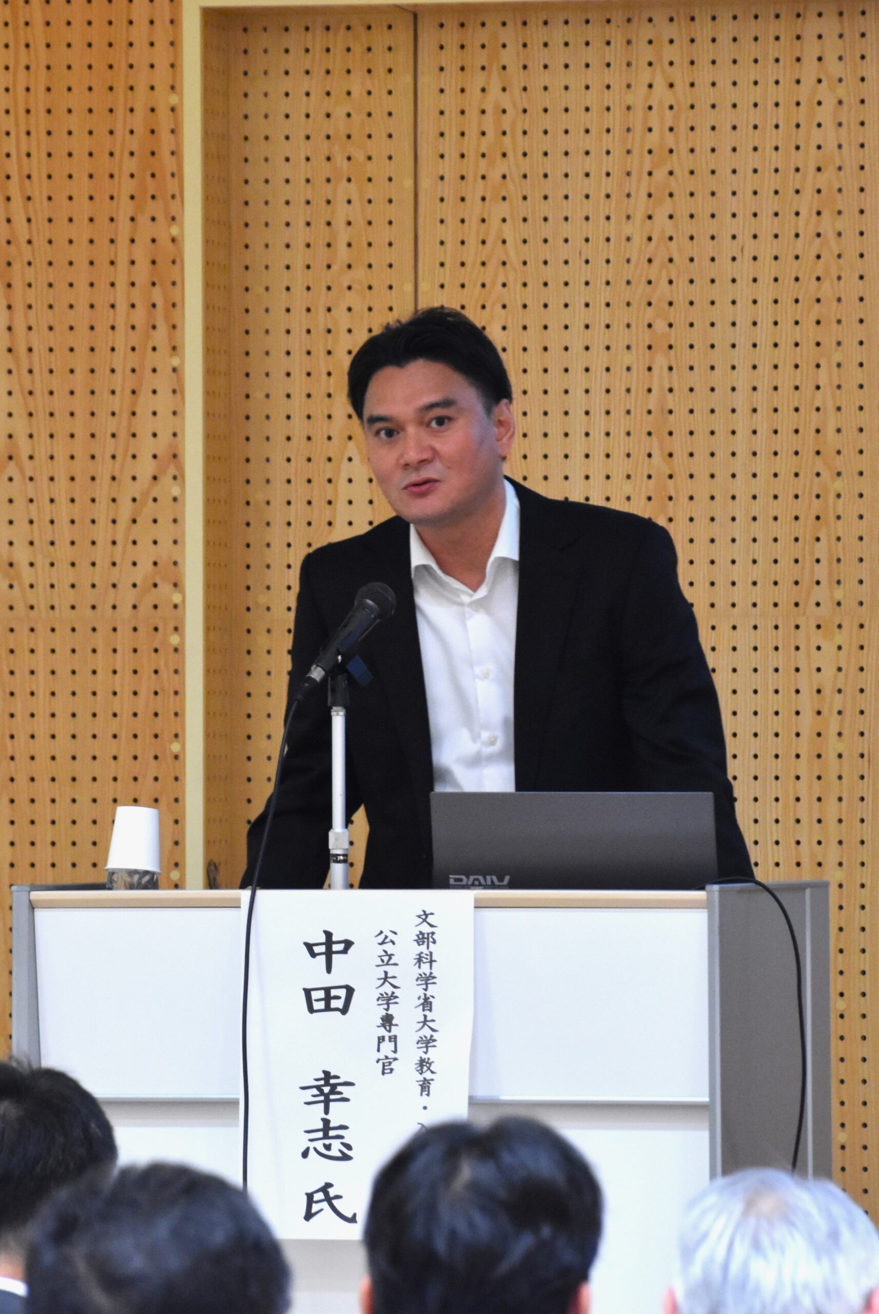 文部科学省大学教育・入試課公立大学専門官の中田幸志氏による基調講演では、「高等教育政策の動向」をテーマに高等教育の現況や、高等教育のグランドデザイン、グランドデザインを踏まえた取り組み等についてお話しいただきました。中田氏は18歳人口が減りゆく現況の解説のあと、「人生100年ということで、“大学は人生で3回行くところになる。1回目は18歳から、2回目は30代~40代でリスキリングのため、3回目は50代~60代で新しい人生の一歩を踏み出すための学びを得る場所になる”とも言われている。そのような時代において、多様な学生に対する教育機会の創出には、多様な教員や学びの質の再構築が必要であり、