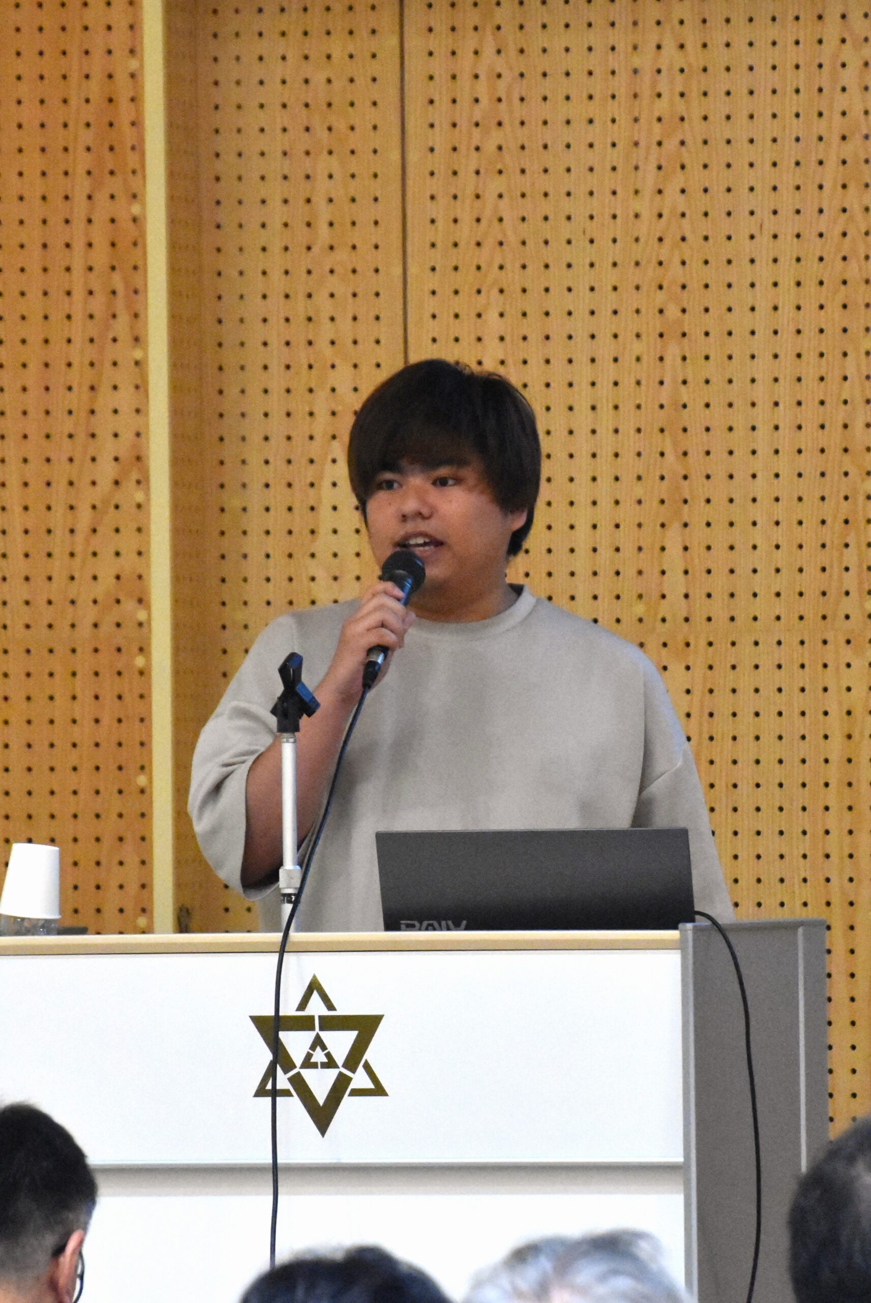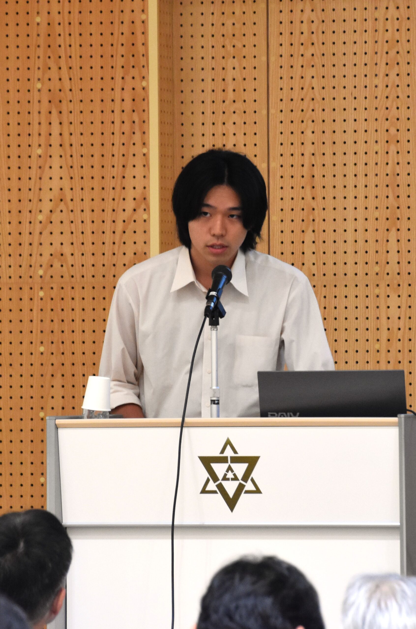 地域情報学研究科の倉本到研究科長から大学院の紹介が行われ、大学院の特徴である2つの学位(修士:情報学、修士:学術)の説明や、カリキュラム編成、研究テーマ、入試スケジュール等が紹介されました。その後、修士1年生の吉岡誠人さんから研究取組事例として、学部時代の研究と現在行っている「影を利用したプロジェクションマッピング」の実験動画や、今後の改善について発表があり、続いて同じく修士1年生の牧将太さんから「Max-plus代数を用いたヒープモデル」をテーマとする、荷物の保管や輸送、生産工程に使用されるヒープモデルの説明や課題についての発表がありました。