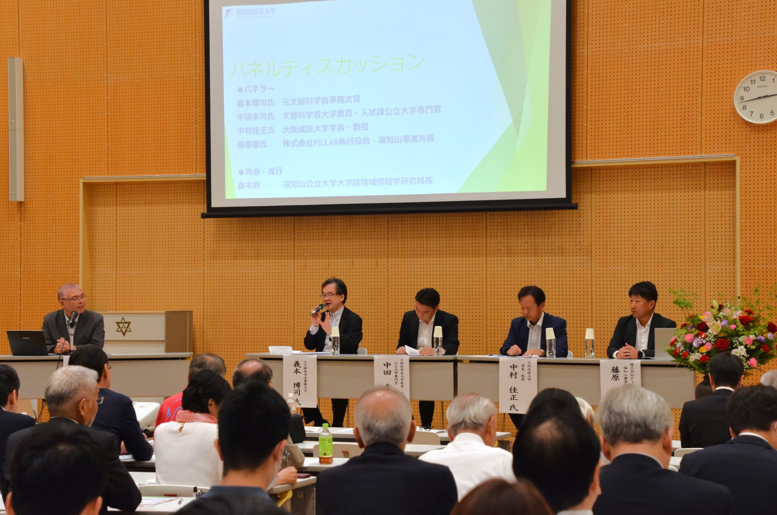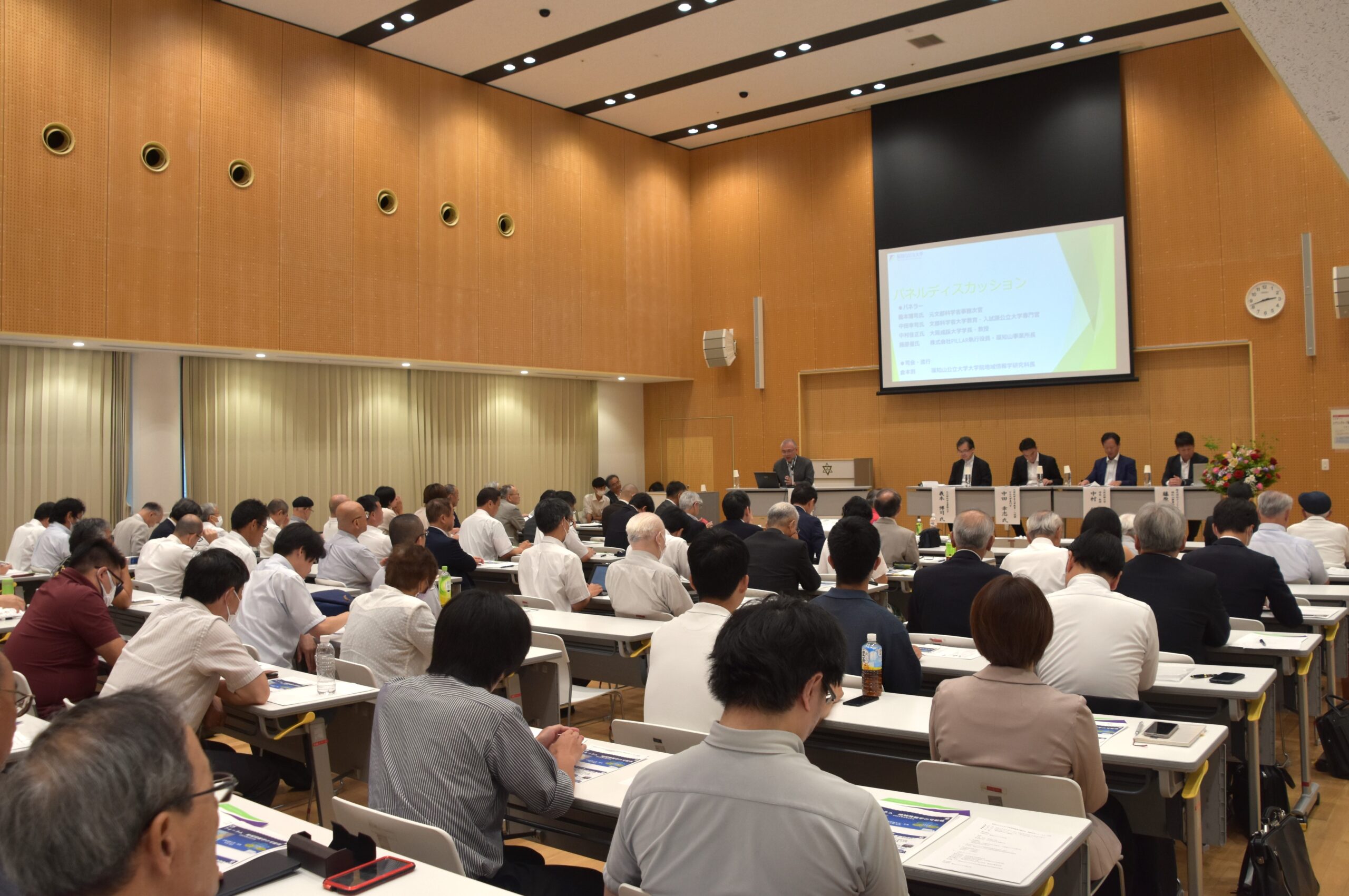 パネルディスカッションには元文部科学省事務次官の義本博司氏、文部科学省大学教育・入試課公立大学専門官の中田幸志氏、大阪成蹊大学学長の中村佳正氏、株式会社PILLAR執行役員・福知山事業所長の藤原優氏が登壇し、倉本到研究科長による司会のもと、討論テーマをもとに実施されました。