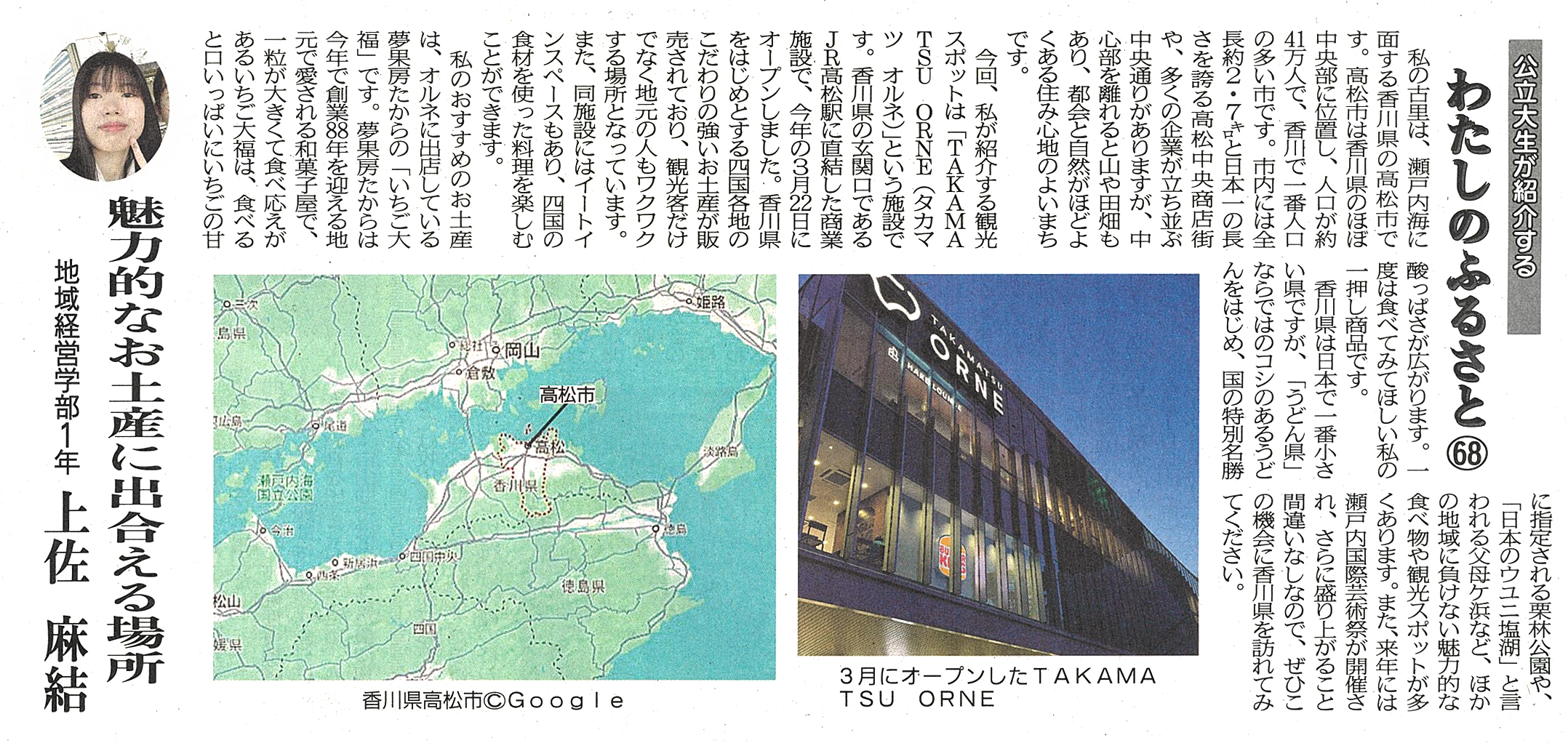 両丹日日新聞(2024年8月27日付け)の「公立大生が紹介する“わたしのふるさと Vol.68”」に上佐麻結さん(地域経営学部1年生)の記事が掲載されました。