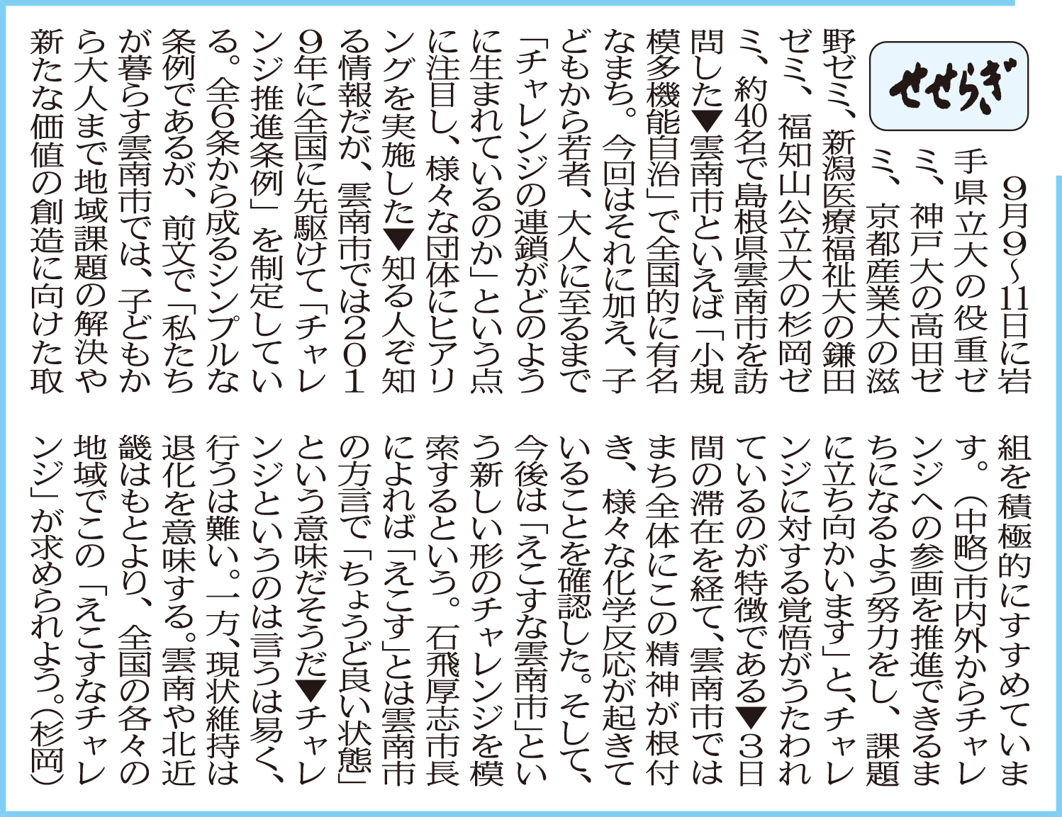 北近畿経済新聞「せせらぎ」に杉岡准教授が寄稿しました レポート 2024.09.21 北近畿経済新聞「せせらぎ」(2024年9月21日付け)に地域経営学部・杉岡秀紀准教授が寄稿しました。 (北近畿経済新聞社提供) 前回の記事はこちら ツイート