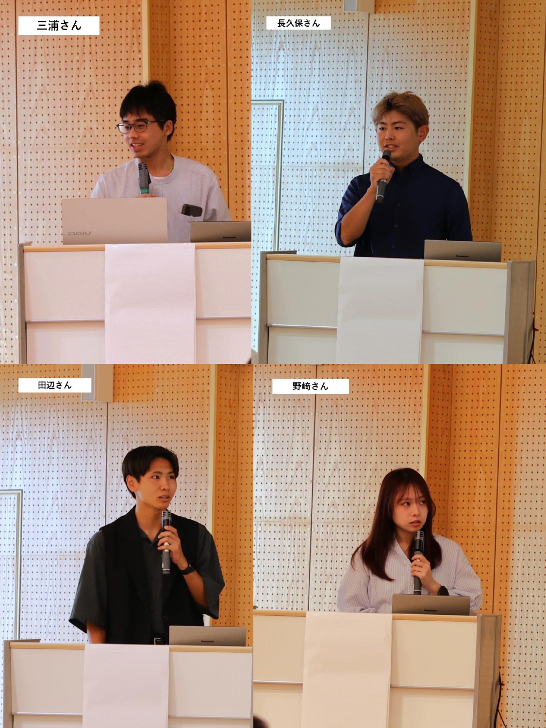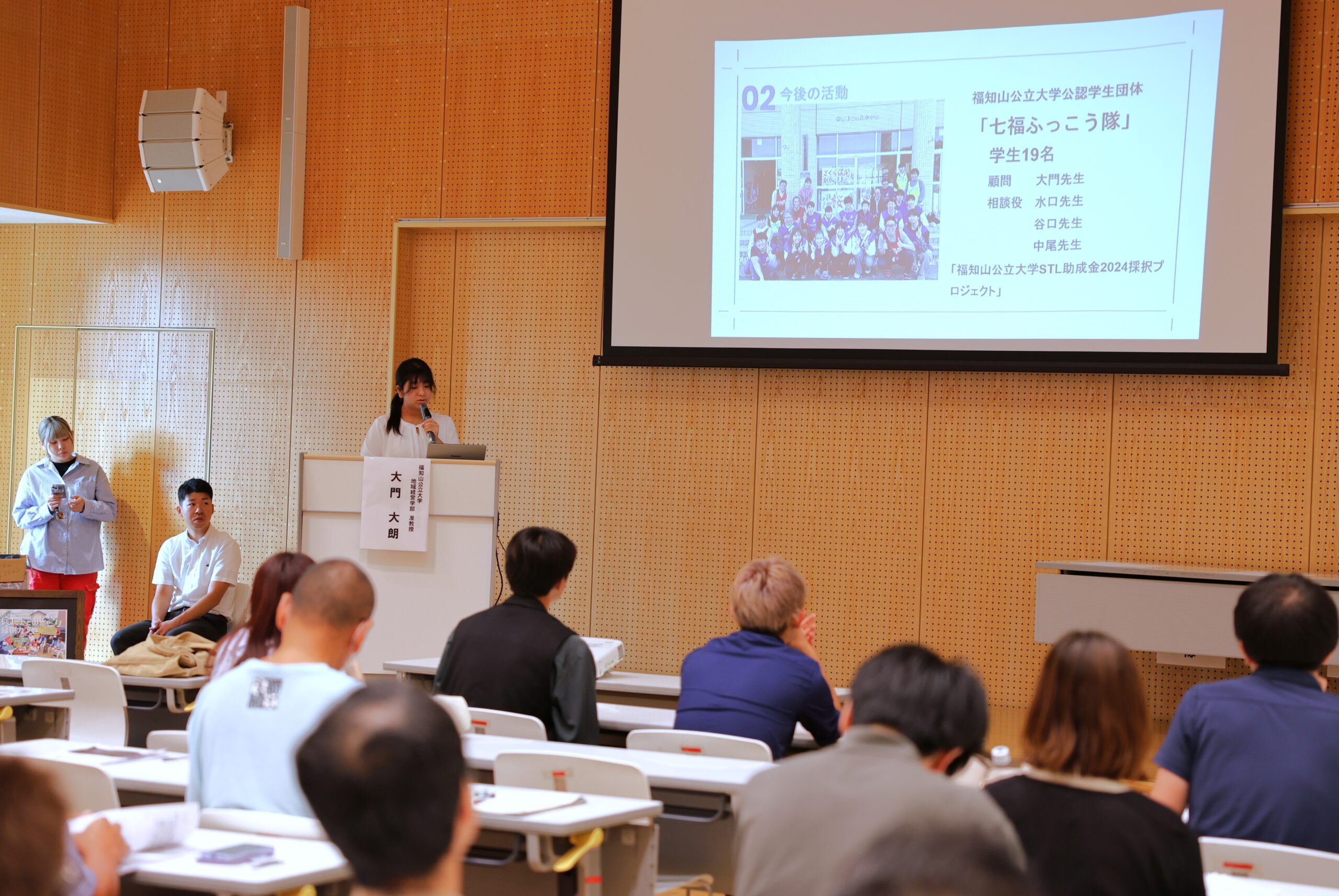 第1部では「大学からの支援活動」をテーマに、大門准教授とボランティアとして参加した学生4名、大学公認団体でSTL採択プロジェクトでもある「七福ふっこう隊」が登壇しました。大門准教授からは今年1月から現在までの支援概要や地震発生直後と現在での支援内容の異なり、被災地リレーなどの説明があり、その後、参加時期の異なる4名の学生ボランティアから、家具の片付けや全国から集まった支援物資の整理・提供、支援を通して感じたことが発表されました。最後に七福ふっこう隊から、プロジェクト立ち上げの経緯や課題、目的、今後についての発表があり、気軽に相談できる機会の創出としてのイベント企画や継続的に実施することの重要性などが語られました。