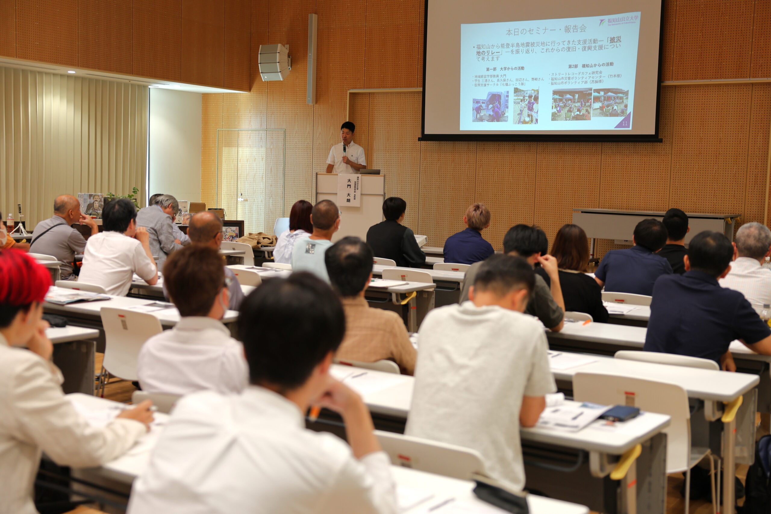2024年9月23日(月)、本学地域防災研究センター及び本学地域経営学部・大門大朗研究室主催により地域防災連続セミナー「しなやかなまち福知山を目指して」の特別回「能登半島地震から10ヶ月を振り返る」を市民交流プラザふくちやま(福知山市)で開催しました。特別回として開催された本セミナーは第1部と第2部に分けられ、支援を行ったそれぞれの団体から活動報告が行われました。