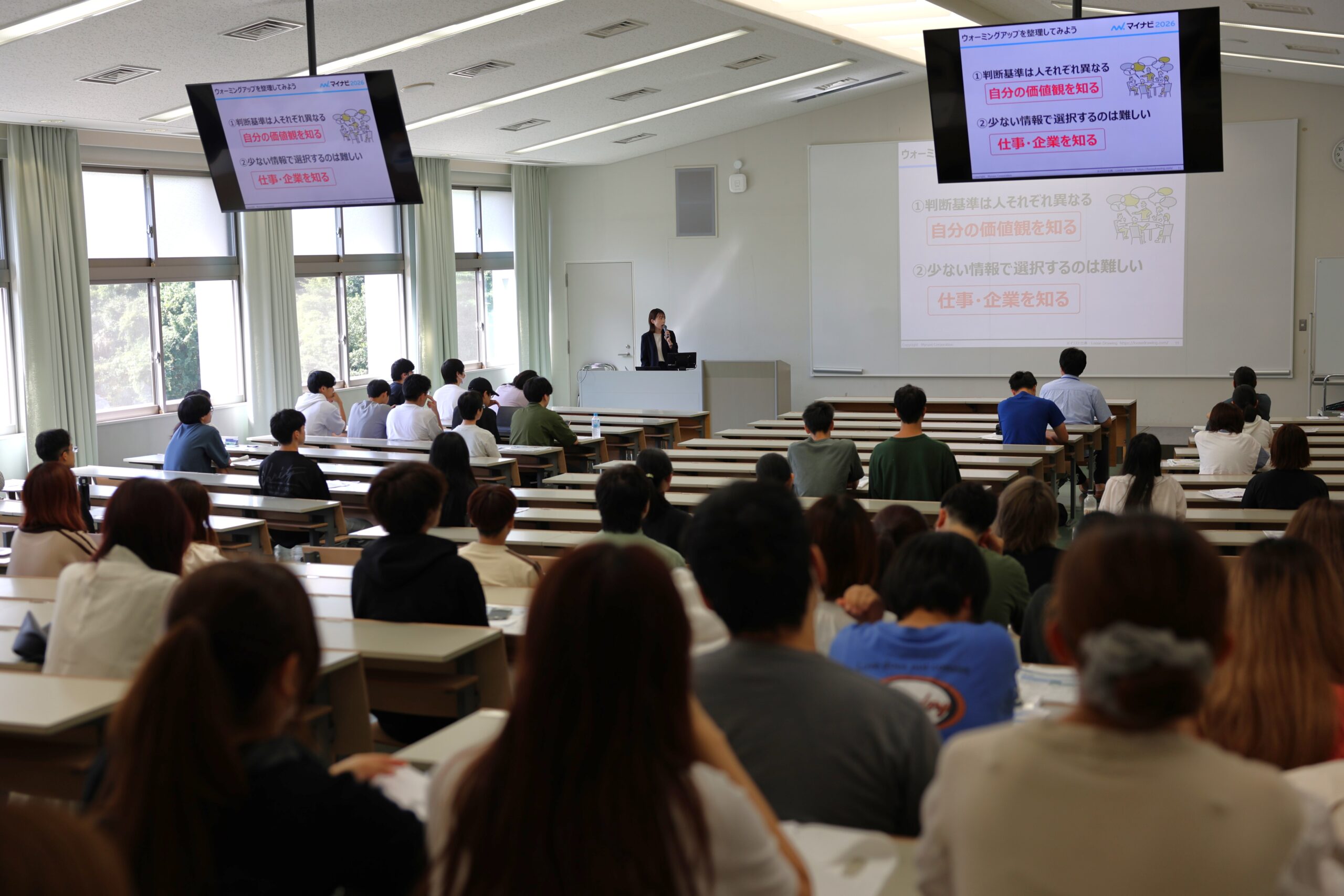 オリエンテーションの導入部分で株式会社マイナビの水田侑里氏は、飲食店を選ぶ際、距離や予算、駐車場、口コミの評価など、情報が多い時とそうでない時の選択肢の違いを例に挙げ、「情報が増えると選択も変わります。判断基準は人それぞれ異なるので自分の価値観を知ることや、少ない情報での選択は難しいので、仕事・企業を知ることが大切です」と説明いただきました。