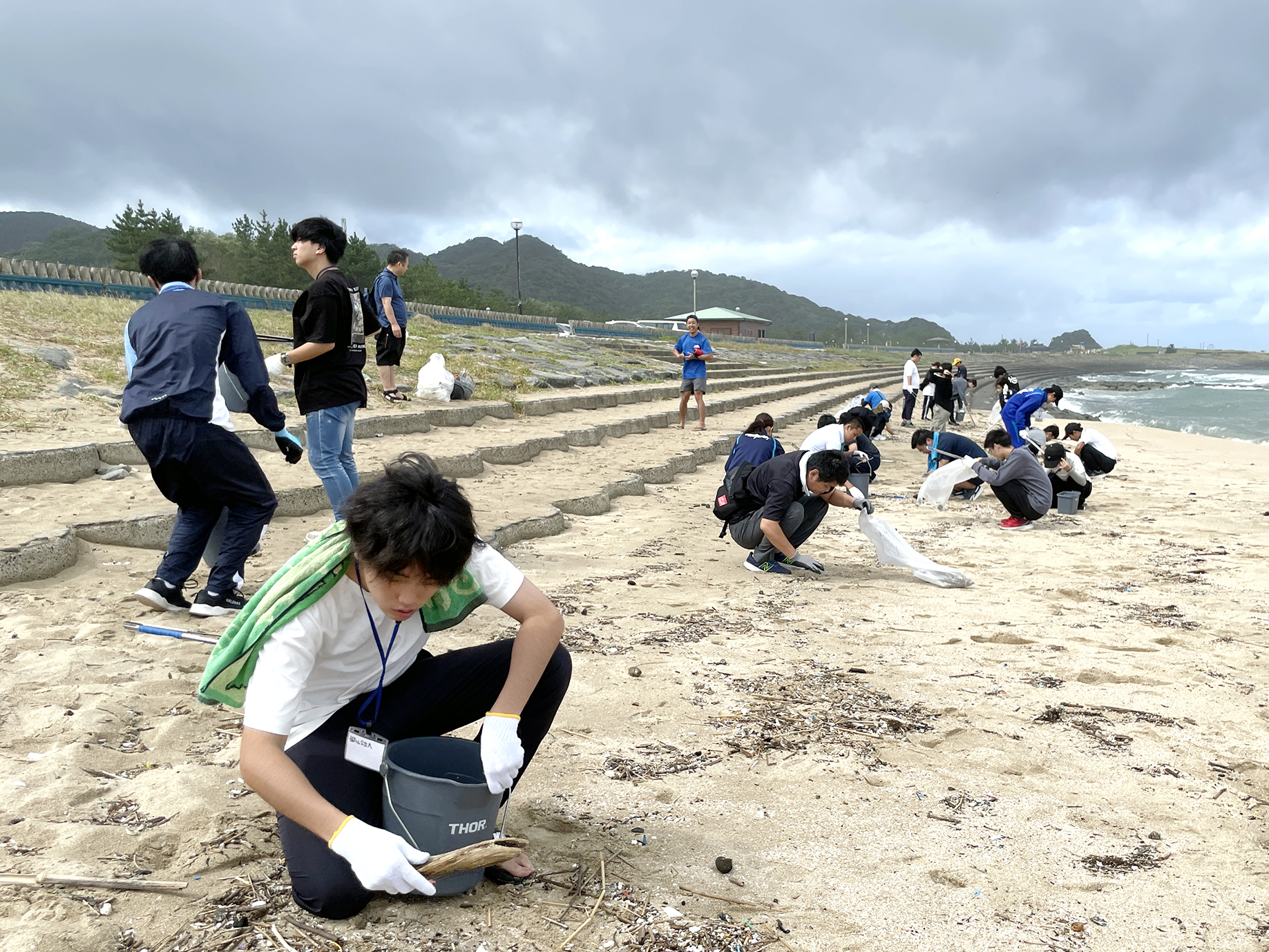 当日午前中は、杉岡准教授のコーディネートのもと、高校生(15名)がチェックインを行った後、地域おこし協力隊の八隅孝治さんの講演を聴講し、その後、プレシャスプラスチック制作を体験しました。体験後は、八丁浜に全員で移動し、高校生15名、大学生9名、自治体職員、杉岡准教授を含む約30名でビーチクリーン(湾岸清掃)を30分間行いました。