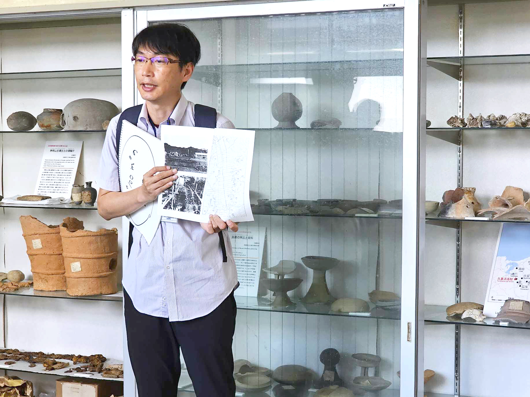 授業では、1年生9名を対象に「半径100mの歴史」というテーマで、学校敷地内の遺跡から出土した土器の解説や、神社・石造物など、どの地域でも目にする一見ありふれたものから歴史を読み解く方法について話をしました。