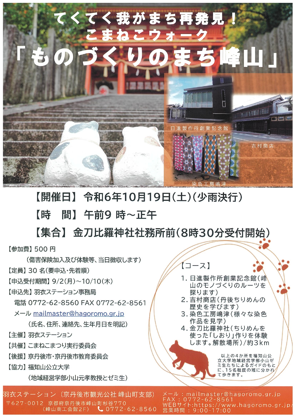 10月19日(土)午前9時からは、小山ゼミ生たちによるガイドのもと、街歩きを行うイベント「てくてく我がまち再発見!こまねこウォークものづくりのまち峰山」が実施されます。