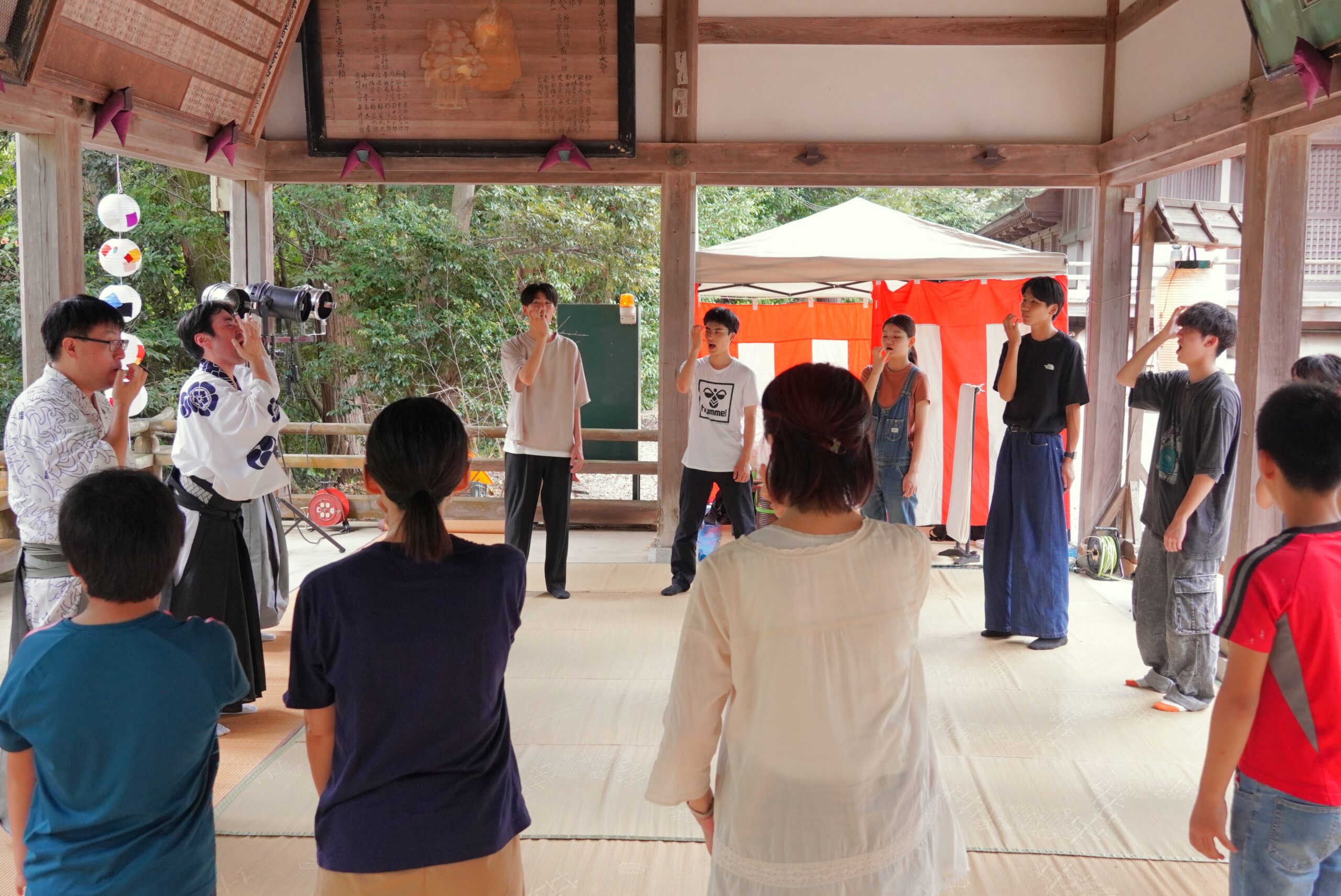 続いて、親子狂言体験が始まり、小学生4名、中学生1名、付添者3名が参加し、小山ゼミの2年生5名がサポート役として、河田氏から事前に特別授業を受けた成果を発揮しました。参加者に狂言でやってみたいことを尋ねたところ、特徴的な笑い方や泣き方、柿山伏での柿を食べる仕草や鳶(とび)の鳴き真似、そろりそろりと歩く動作が挙がり、順番に実践しました。小・中学生たちは大学生たちと一緒に狂言での笑いや泣きを大きな声で挑戦したり、「飛びそうな」「ぴい」という山伏役と柿主役のグループに分かれて掛け合いを行いました。体験会に参加した中学生の女の子は、「柿山伏は小学校で部分的にしか体験したことがなかった。今日参加してたくさん体験できて楽しかった」と感想が述べられました。