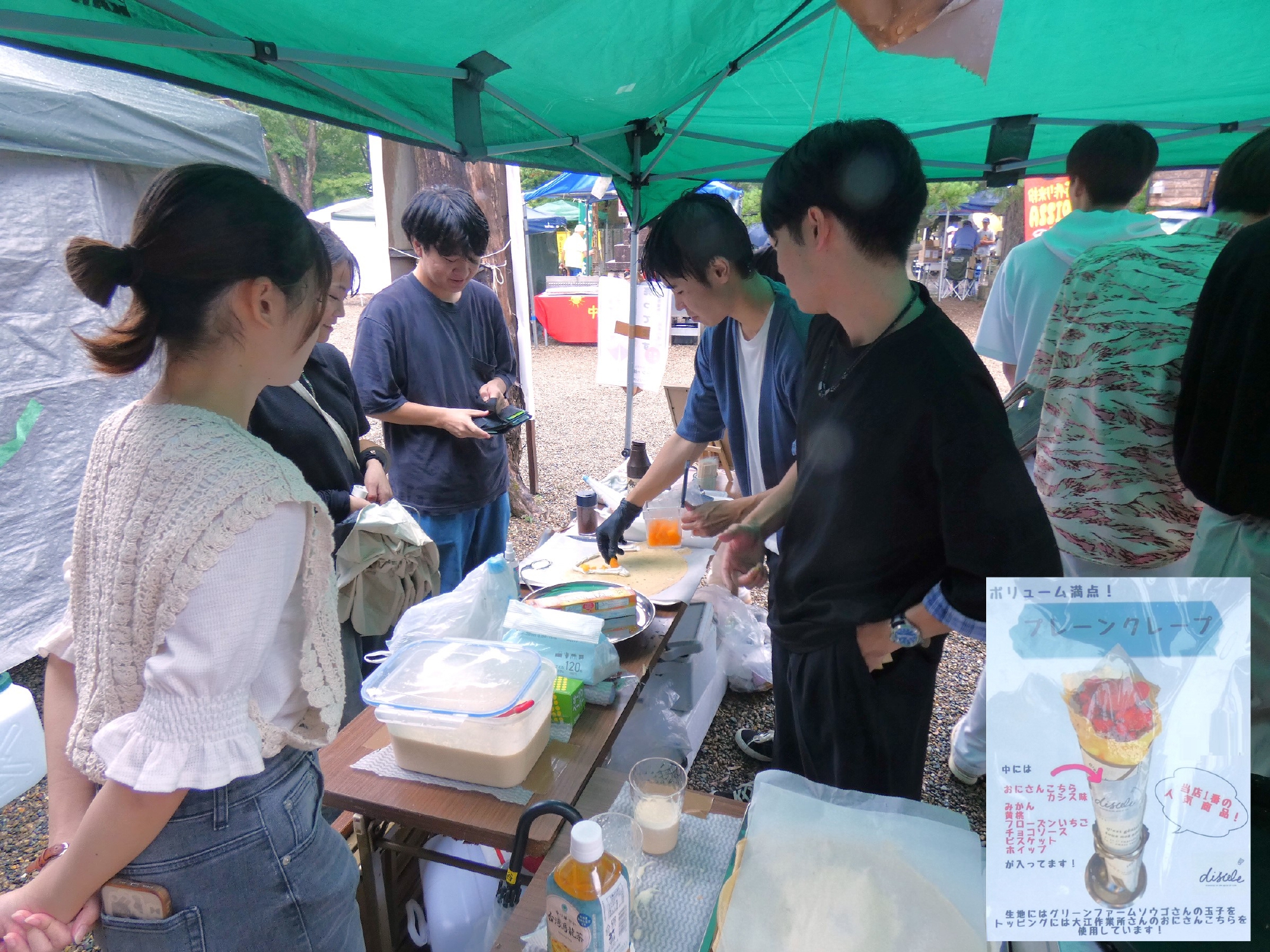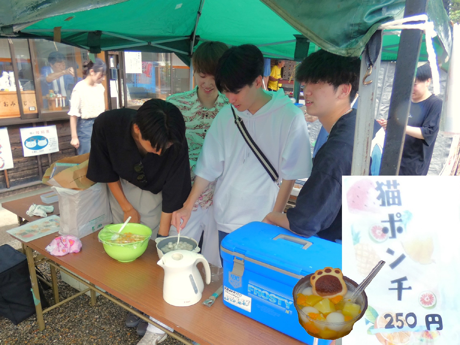 こんびら手づくり市は毎月第3日曜日にも開催されており、22日(日)には金刀比羅神社境内に多くのブースが立ち並び、猫をモチーフにしたアクセサリーや雑貨、小物などの手づくり品をはじめ、小山ゼミの3年生によるクレーブ販売、2年生による猫ポンチ(フルーツポンチ)の販売が行われました。当日は雨にも関わらず、手づくり市やその他の企画や展示を目的に来た人で賑わいました。