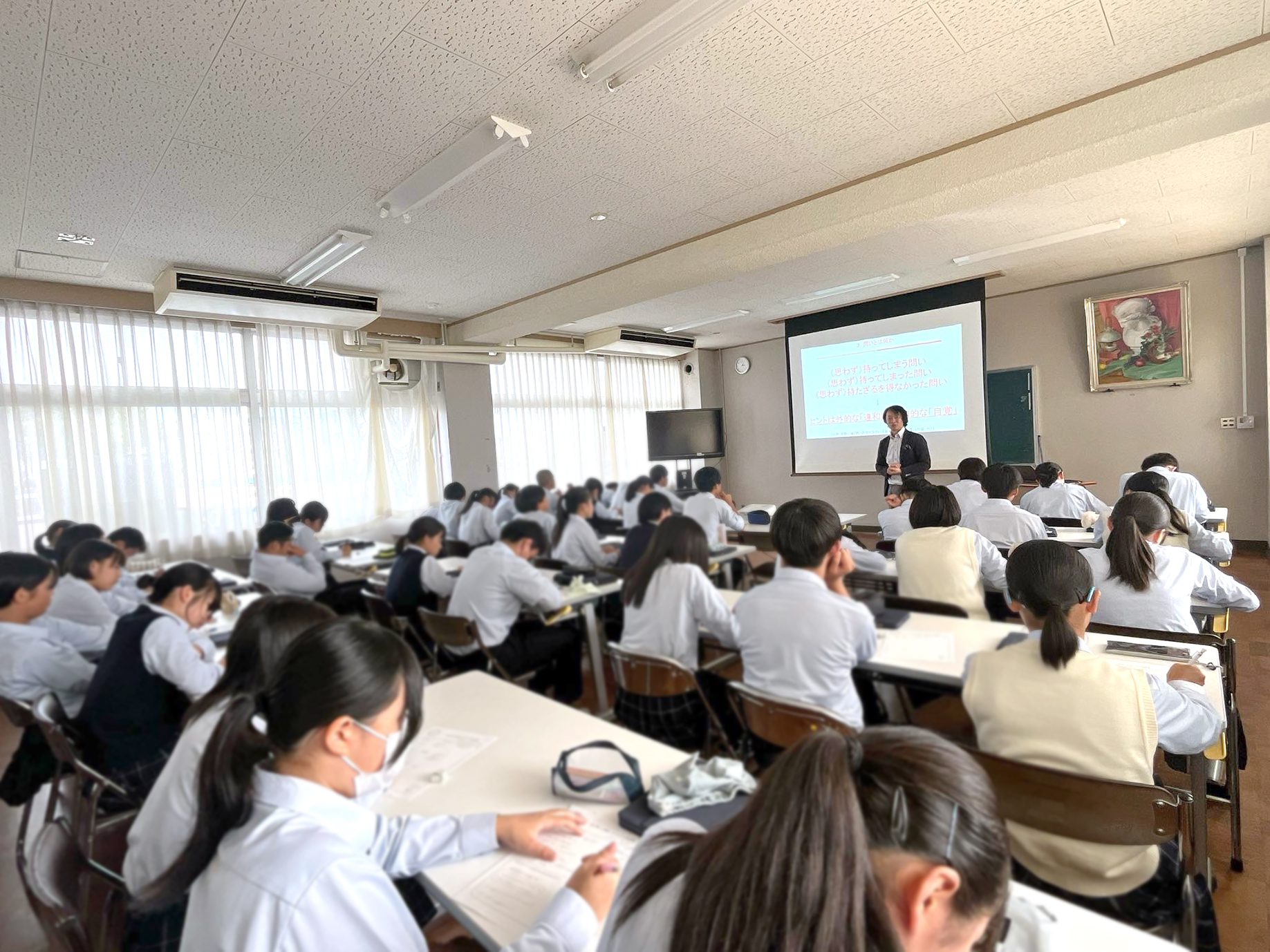 この授業は毎年1回実施されており、今年は同校普通科1年生63名が参加しました。杉岡准教授は「探究のススメ - 良い問いのつくり方 -」をテーマに、生徒が主体的に参加できる形で講演を行いました。