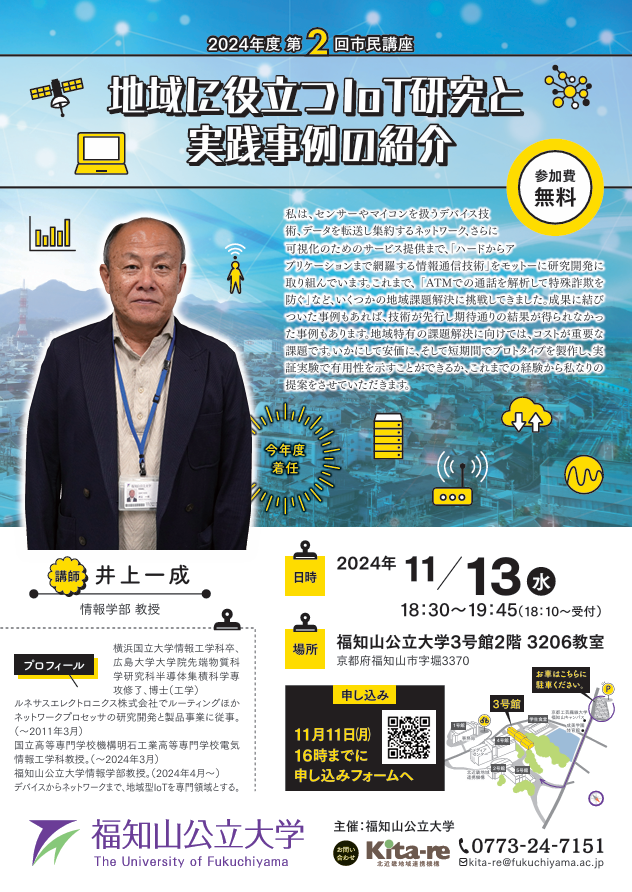 2024年11月13日(水)、2024年度第2回市民講座「地域に役立つIoT研究と実践事例の紹介」を本学で開催します。