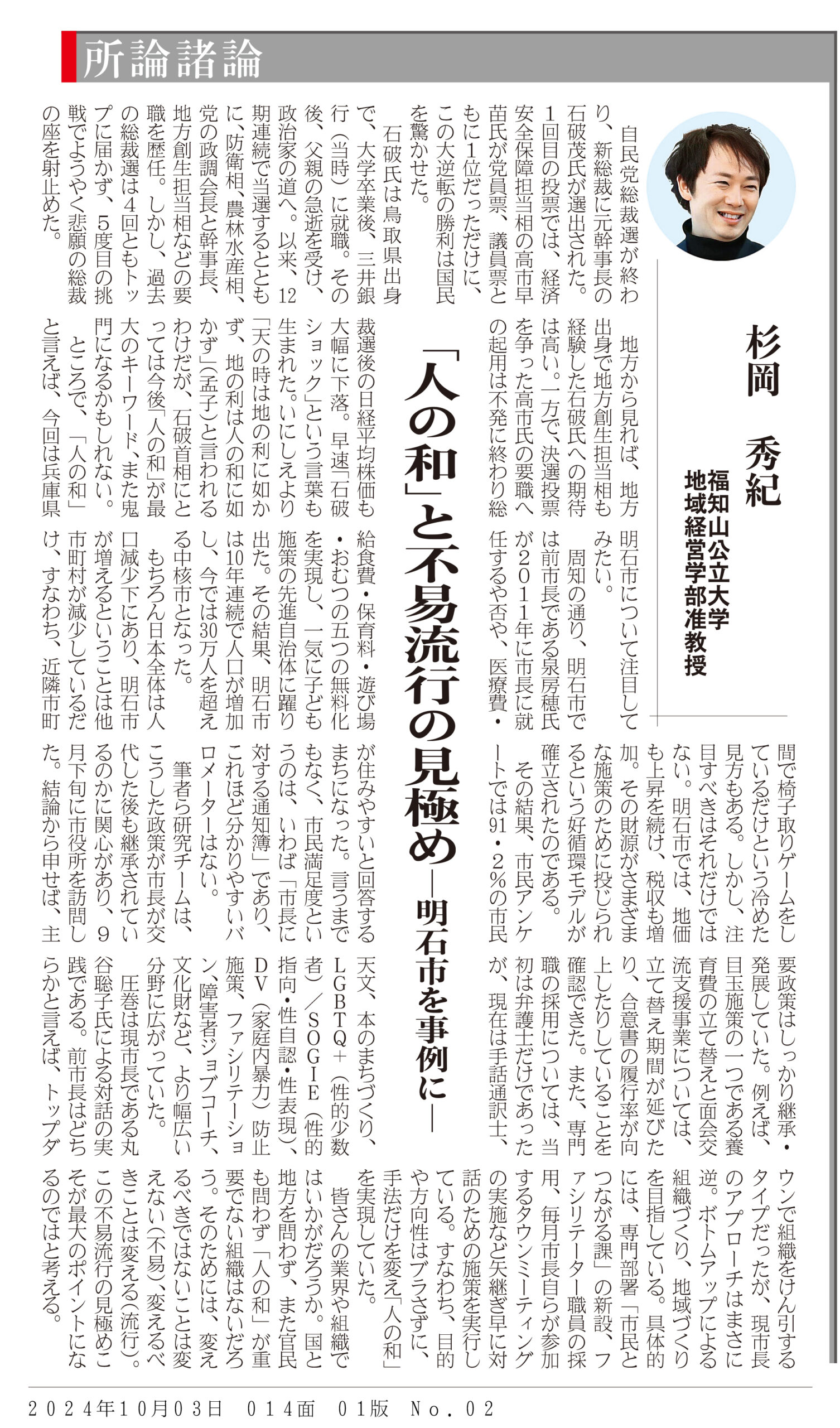 日刊建設工業新聞「所論諸論」に杉岡准教授が寄稿しました レポート 2024.10.04 日刊建設工業新聞「所論諸論」(2024年10月3日付け)に、地域経営学部・杉岡秀紀准教授が寄稿しました。 (日刊建設工業新聞社提供) 前回の記事はこちら ツイート