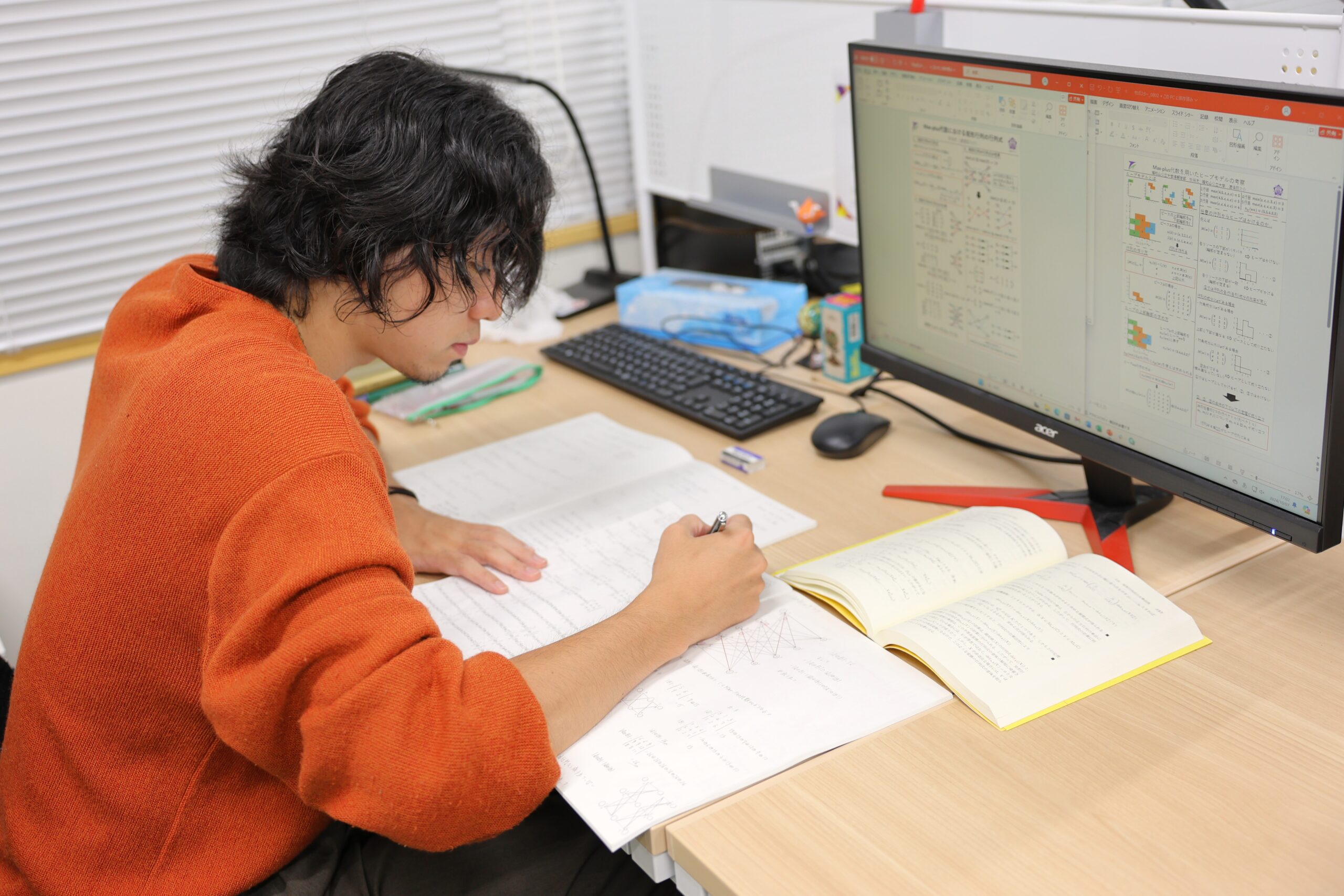 学部での研究が楽しく、このまま続けたいと思っていた矢先に大学院の新設が決まり、進学しました。正方形での行列式で研究していた学部時代でしたが、その基礎知識をもって矩形行列(いわば、長方形)での行列式を研究しています。研究はPCに向かうのではなく、基本的にはノートに数式や図をひたすら書き込んでいる時間の方が長いです。