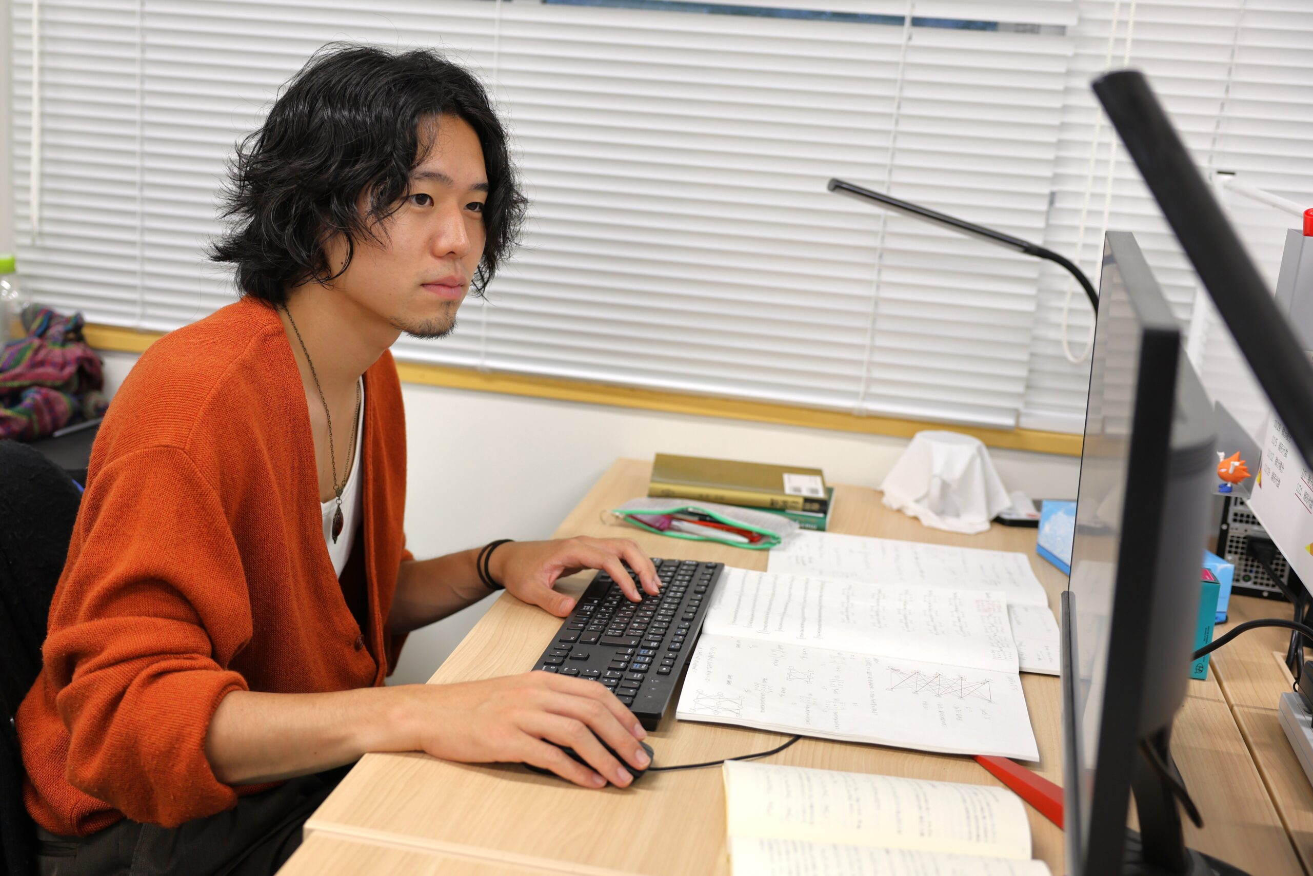 「2年生で研究に専念できる自由な時間を生み出すために、1年生でなるべく単位を取得しておくといい」と渡邉先生からのアドバイスもあり、修士1年生の後期では、月・火・木に計5科目の講義を履修しています。休みと研究は割と区別していますが、講義前後に研究したりと、大学にいる時は基本的に研究しています。自分の場合は、ファッションが好きで洋服代や生活費の捻出のため2つのバイトを掛け持ちしています。あと、火曜4限には情報学部の演習科目「数学演習Ⅱ」のTA(ティーチング・アシスタント)として学部生が授業中に分からない部分の補助や指導を行っています。