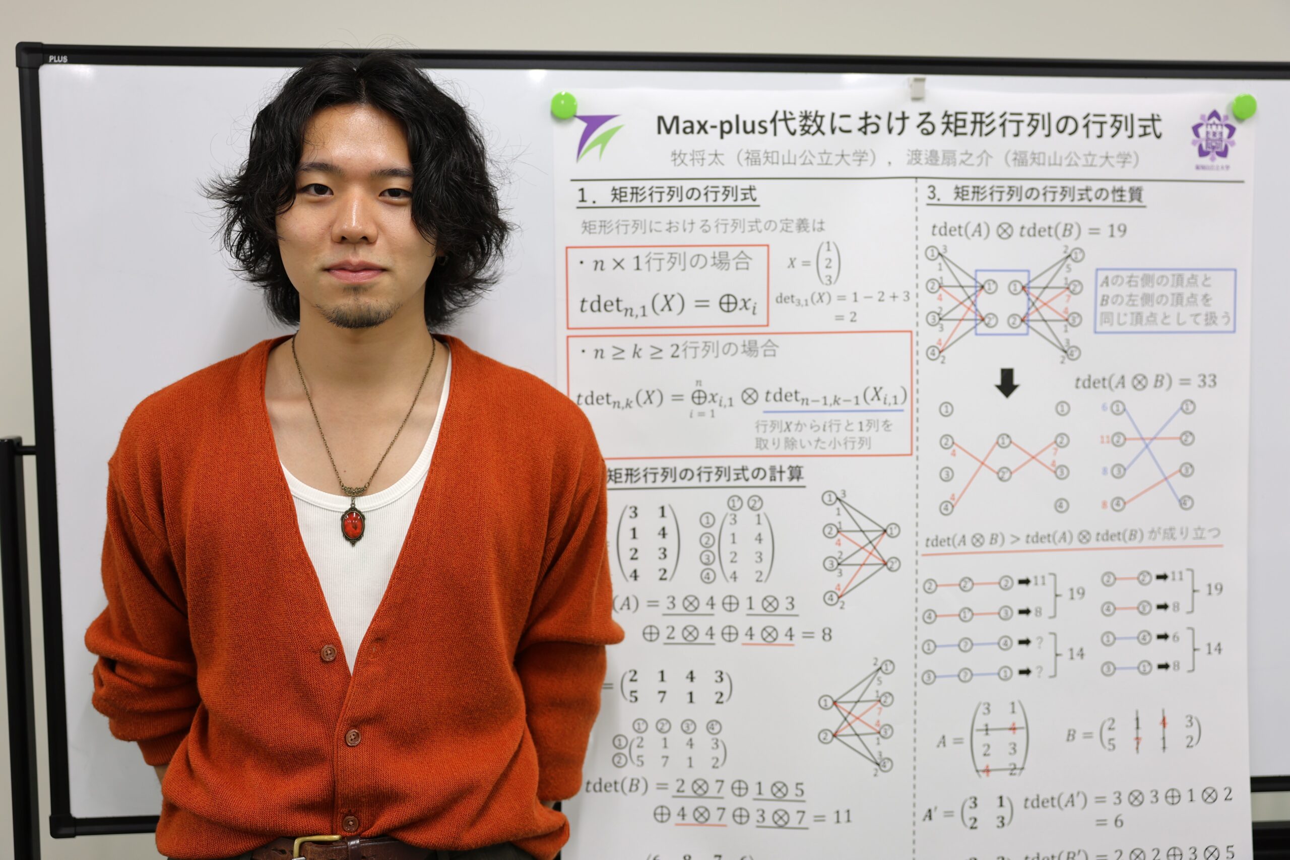 大学数学における線形代数で学ぶ行列の行列式の概念は、行列の行数と列数が等しい行列に対して定義されます。Max-plus代数とは使うことのできる演算を「Max(最大値)」と「Plus(足し算)」に限定した数学で、この代数における行列の行列式を計算すると行列から決まる2部グラフの最適マッチングが得られることが知られています。「2部グラフの最適マッチング」とは、例えば「社員」と「仕事」という2つの属性に対して、最も適切なペアを求める最適化問題です。私は、Max-plus代数上で行数と列数が異なる行列に対して行列式を定義したときにどのような最適化問題で説明でき、行列式の値からその最適化問題に対して何が得られるかに興味があり研究を行っています。