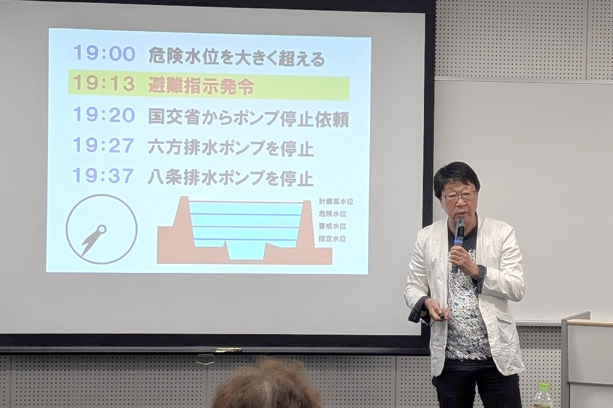第1回は、中貝宗治氏(前豊岡市長・一般社団法人豊岡アートアクション理事長・福知山公立大学客員教授)に登壇いただき「防災行政とリーダーシップ-2004年台風23号が襲った豊岡市の事例から-」をテーマに、2004年の台風23号によって甚大な被害を受けた豊岡市を基に、当時の円山川の水位と時間経過を示しながら、気象警報発表、災害警戒本部・災害対策本部設置、避難勧告・避難指示発令、堤防決壊による防災行政無線での避難呼びかけなどが説明されました。