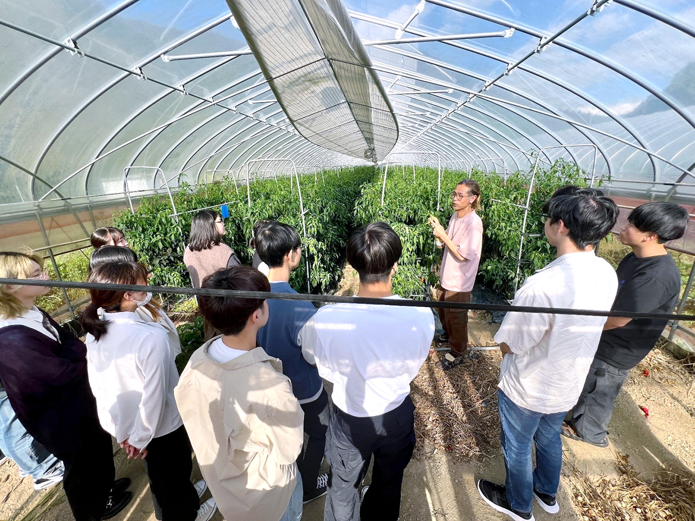 続いて、同社と連携して実施している本学のSTL助成金採択プロジェクト「アグリサーキュラーデザインin Fukuchiyama」のメンバーが、「規格外万願寺とうがらしを利用した『万願成就あめ』の商品開発」について発表しました。講義の最後には、同社がクラウドファンディングを活用して開発した三和ぶどう100%のジュースの試飲会も行われ、農業ビジネスにおける商品の価値や消費者との繋がりの重要性を体感しました。また、久保社長の案内で万願寺とうがらしの栽培ハウスを見学し、栽培や収穫のプロセスについても具体的に理解を深めました。