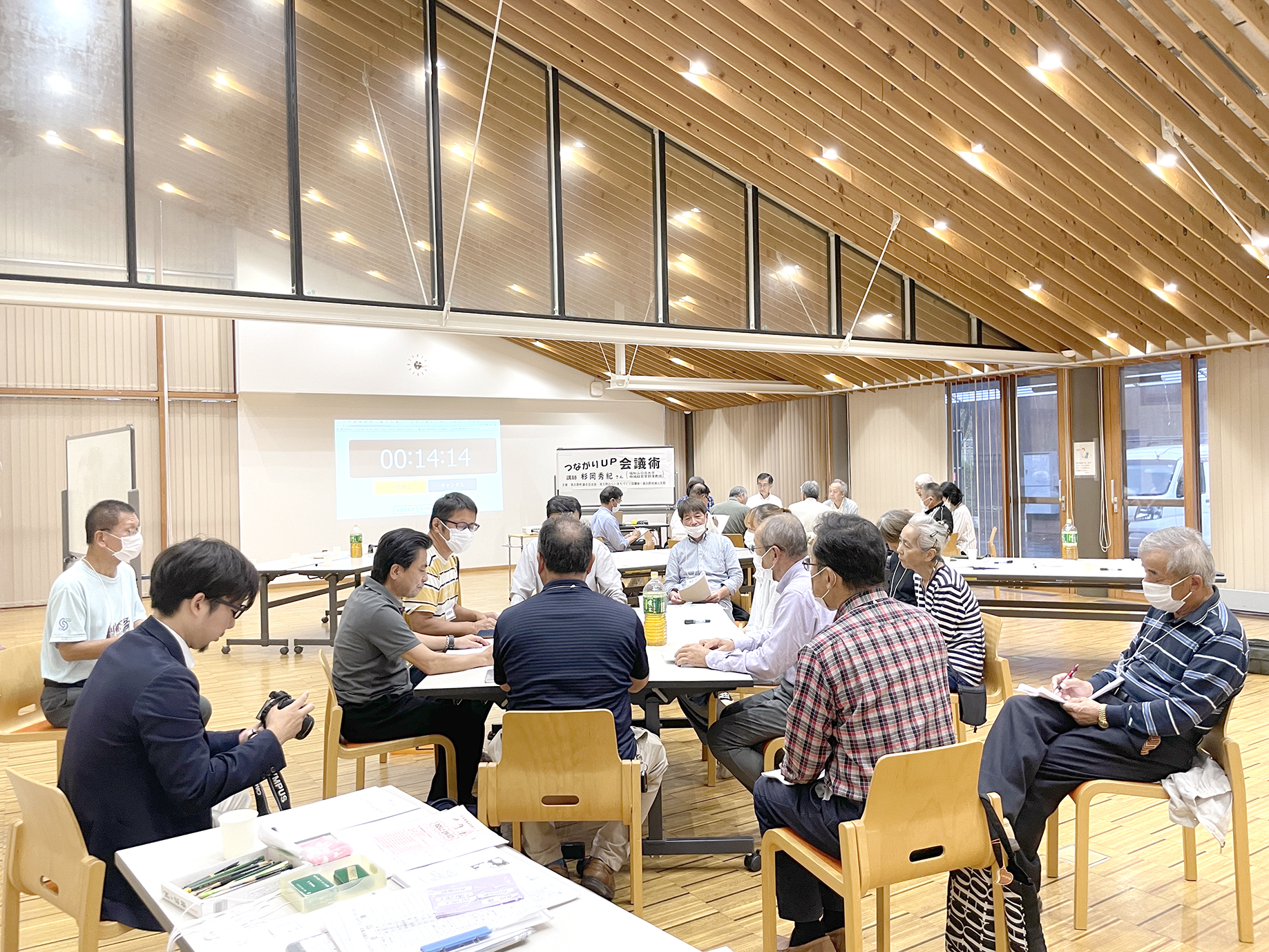 本講座は、夜久野町連合自治会、夜久野みらいまちづくり協議会、夜久野地域公民館が主催し、夜久野地域内の社会教育の充実を図るために企画されたものです。当日は、自治会役員、みらいまちづくり協議会役員、公民館の役員、大学生など約30名が参加しました。前半は、杉岡准教授が「なぜ話し合いが必要か」「つながりアップのためのポイント」といったトピックについて講義を行い、後半は杉岡准教授がコーディネーターを務め、全参加者によるワークショップを実施しました。