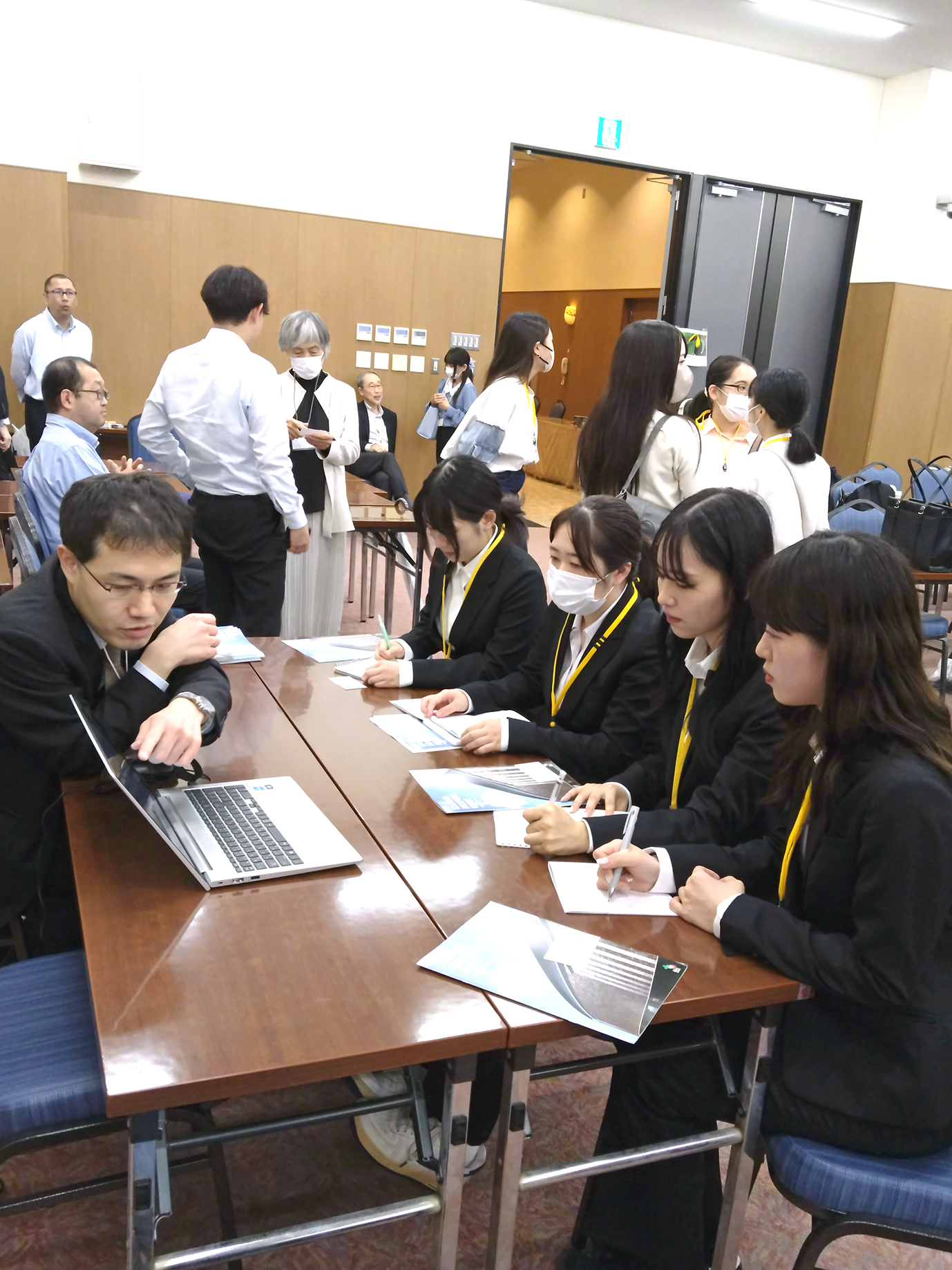 岡本ゼミの7名が発表した内容は、「標準化死亡比により評価した全国のDPC病院における死亡退院率の分析」で、医療ビッグデータをパワークエリで加工し、データウェアハウス化する手法を学習したゼミの成果を報告するものでした。セミナーの目的には学生の就職活動支援も含まれており、発表後は、近畿一円から集まった約100名の学生と病院との交流会が行われました。各病院の診療情報管理室の職員との個別テーブルでの面談を通じて、病院での業務内容など、就職活動に役立つ情報交換の場となりました。