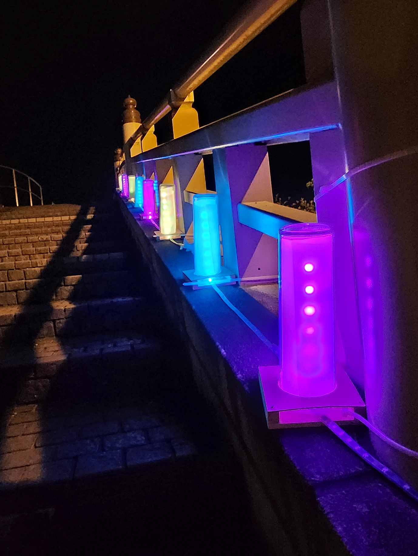 本イベントには、本学のSTL助成金採択プロジェクトが複数参加しました。その一つである「福知山プロジェクションマッピング2024」は、昇龍橋での和紙灯籠のイルミネーションライトアップのほか、ドッコちゃんの3Dモデルの上映や手持ち行灯の貸し出しを行いました。色とりどりに光る8つの行灯に目を輝かせる来場者が多く見受けられました。