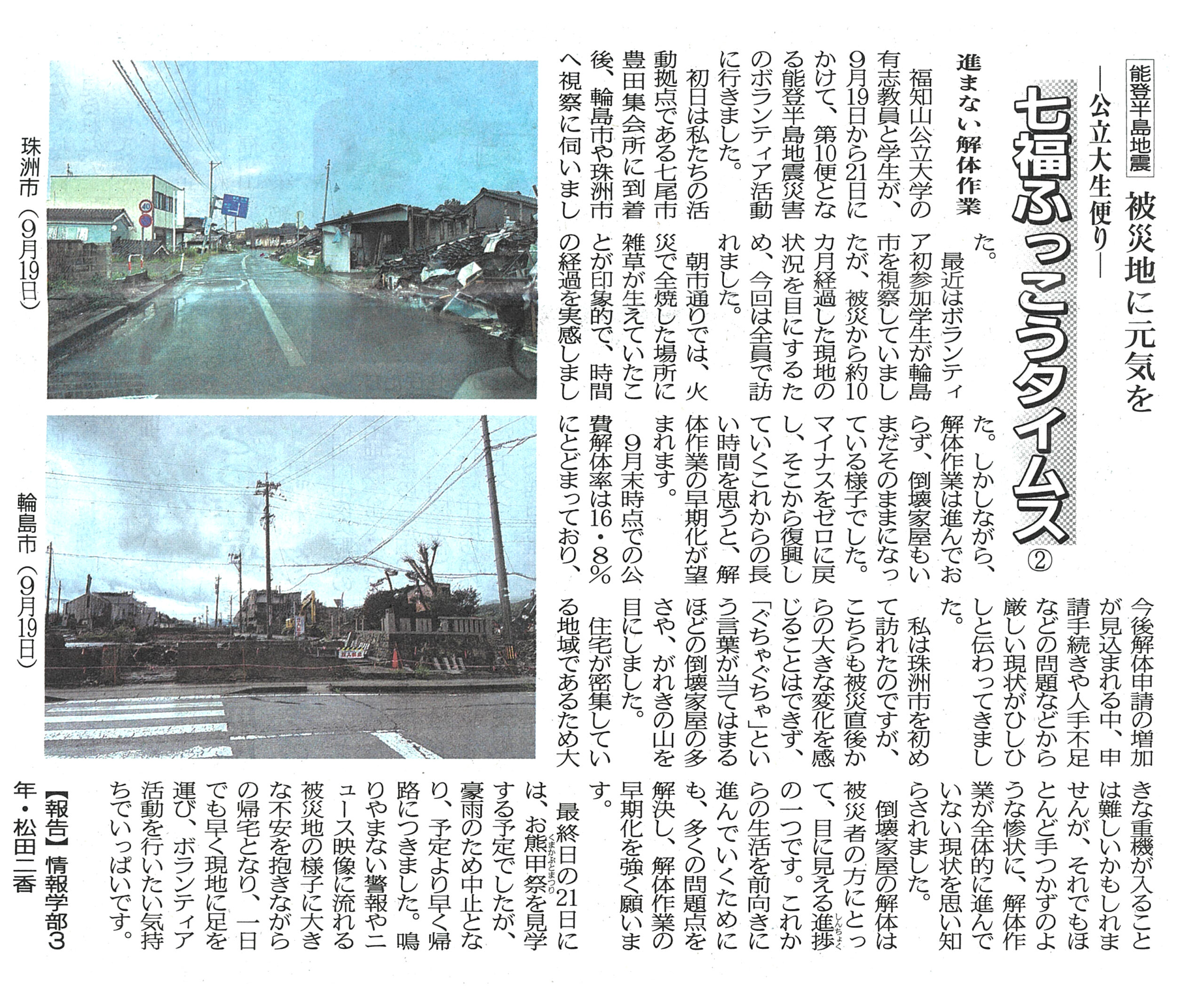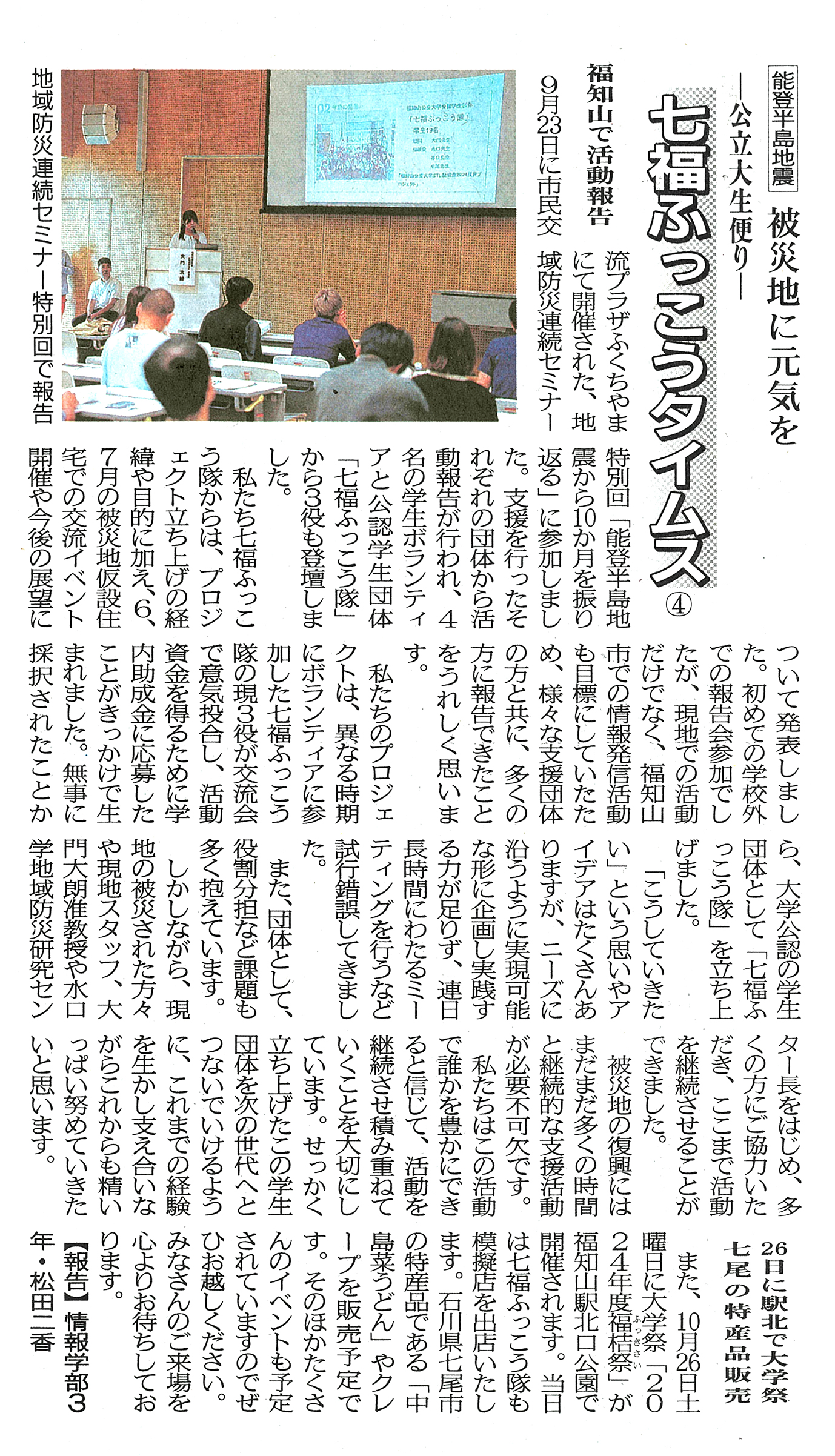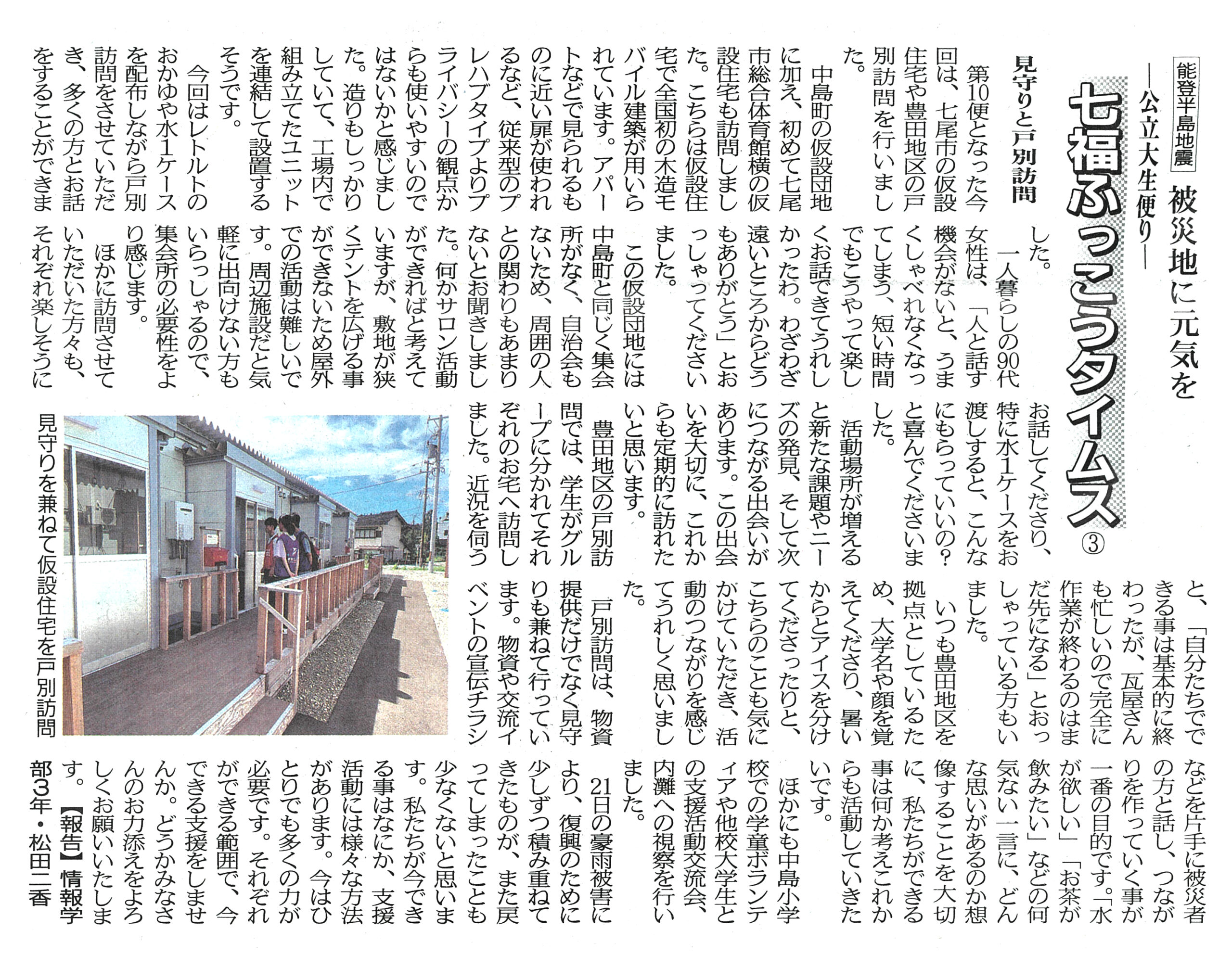 両丹日日新聞(2024年10月21日付け、22日付け、24日付け)に、本学公認団体「七福ふっこう隊」が被災地支援の様子を記す『七福ふっこうタイムス②③④』が掲載されました。