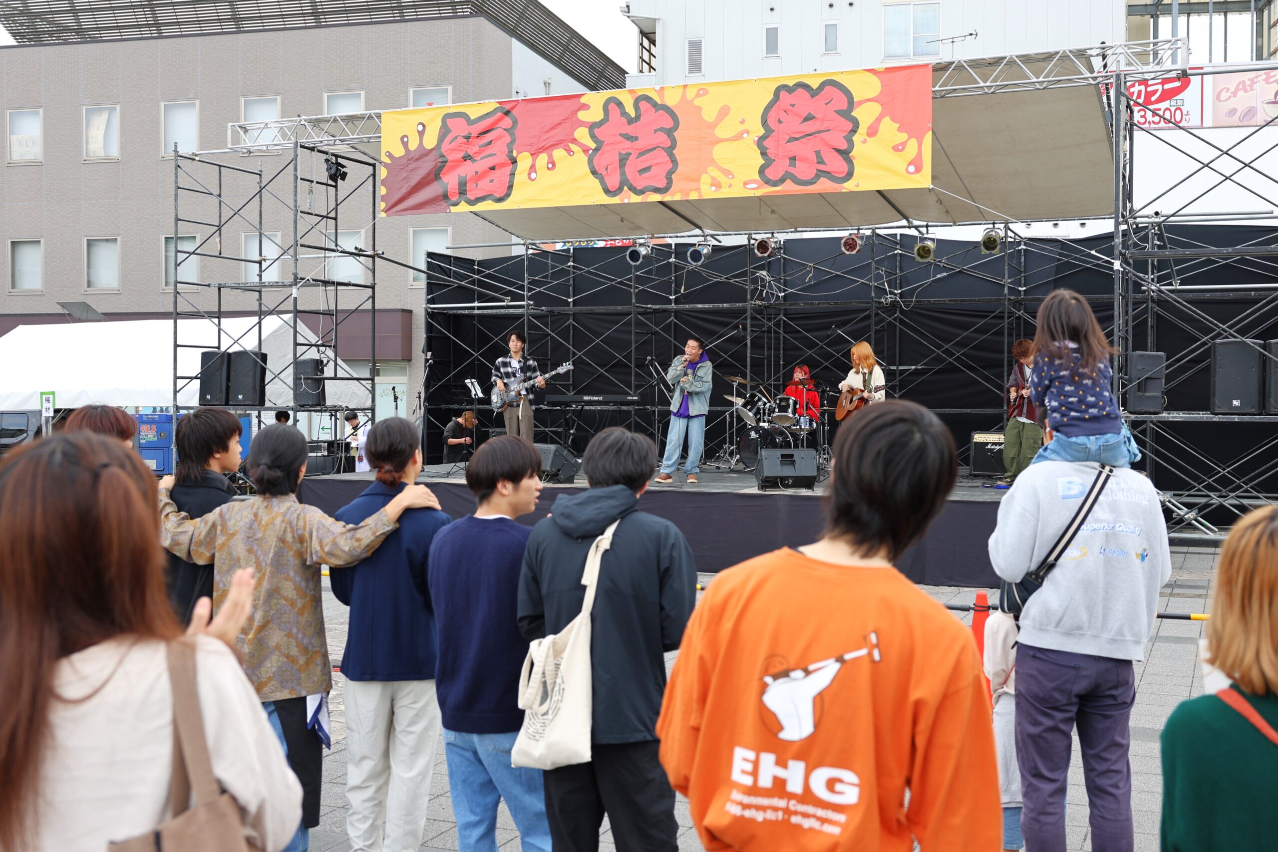 お昼休憩の間にも落語講談サークルが1席披露し、午後からは吹奏楽サークル「トゥッティ」、アカペラサークル「かんた~れ。」がステージ上で練習の成果を披露しました。その後、ゲストバンド「フリージアン」が歌い始めると、その透き通った声量ある歌声に観客たちは魅了され、手拍子などで盛り上がりました。続く、総勢5組のよしもとお笑い芸人による「よしもとお笑いライブ」では各組のネタが披露後に「だるまさんが転んだ」をモチーフにしたコーナーが行われ、再度会場は爆笑が巻き起こっていました。そして、演劇サークル「青い鳥」、ボーカロイドライブ「Riot…G」によるパフォーマンスで福桔祭の最後が締め括られました。