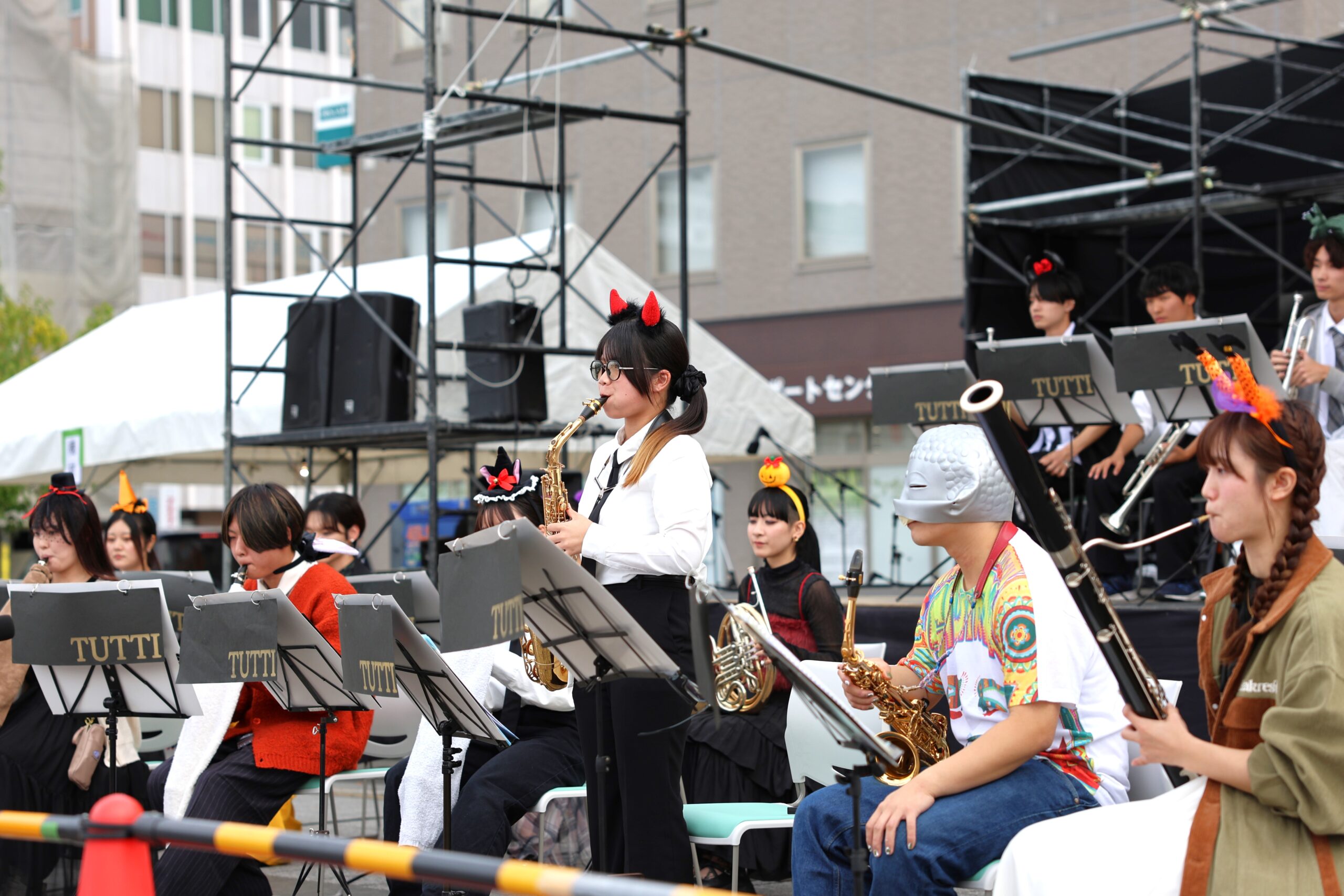 当日は、ラジオ番組制作団体「fm学生探偵」が司会進行を務め、軽音楽サークル「UNION」の熱いビートで開幕し、各バンドが1曲ずつ披露していきました。演奏後には「来てもらう人たちに楽しんでもらえるよう、感情を顔に出してパフォーマンスした」と笑顔でコメントを述べていました。その後はDJサークル「Fortune House」、ダンスサークル「ALL FREE」と続き、ステージ発表に見入る人と模擬店でお昼ご飯を買う人などで、北口公園は活気に溢れていました。ダンスサークルの学生からは「想像以上に緊張したが、その緊張も楽しむことができた」と晴れ晴れした表情で語ってくれました。