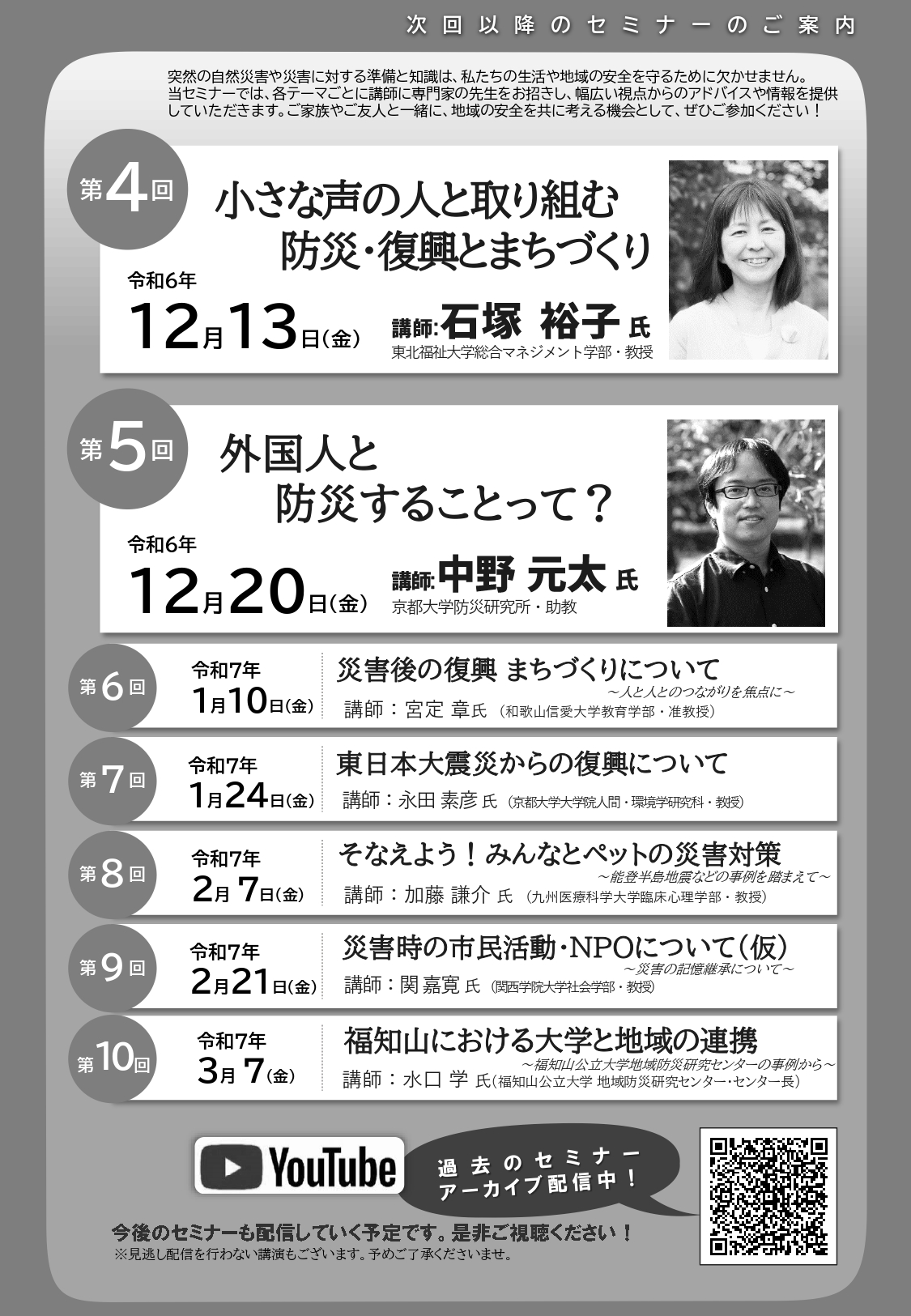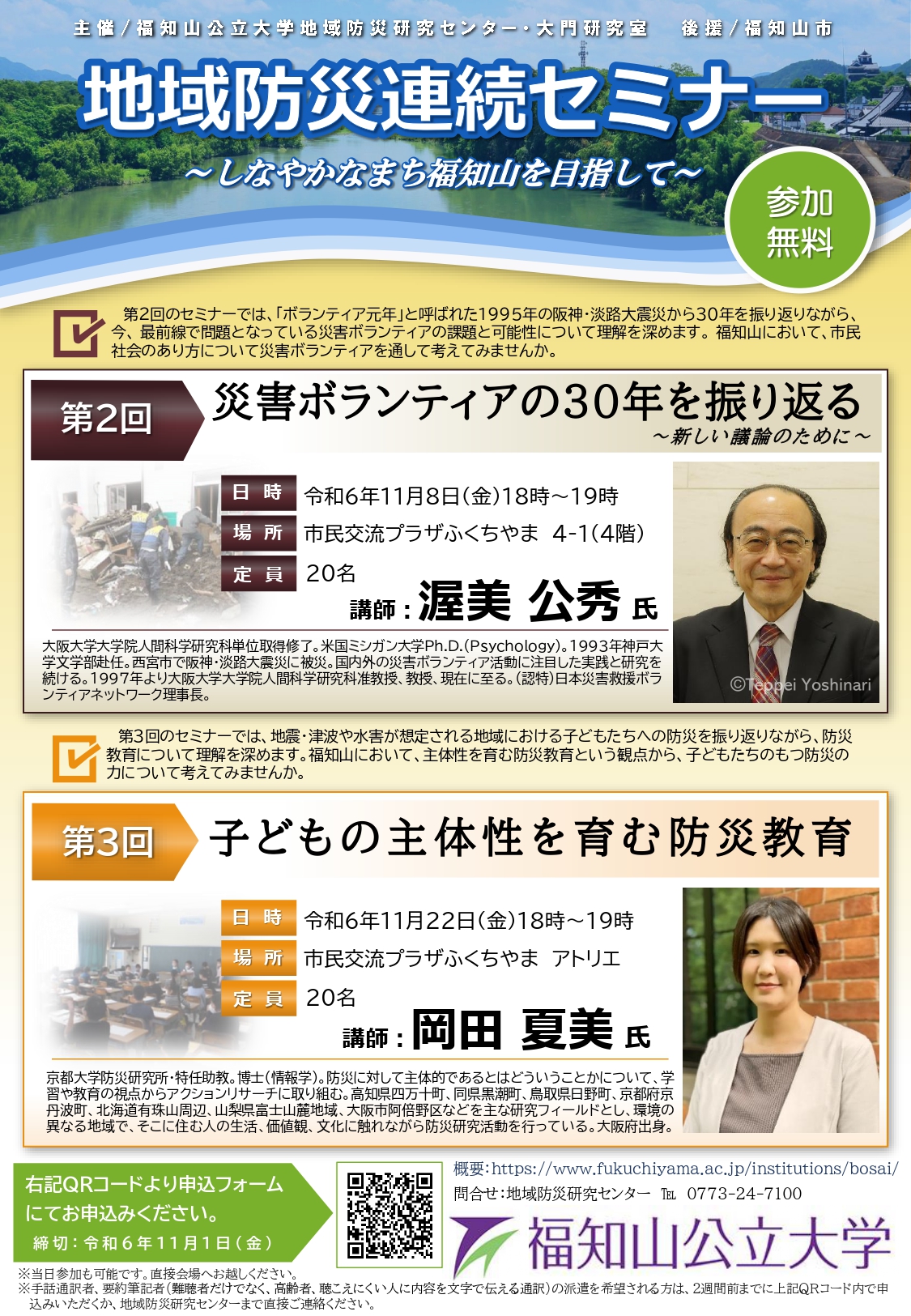2024年11月8日(金)・22日(金)、本学地域防災研究センター及び本学地域経営学部・大門大朗研究室主催により第2・3回地域防災連続セミナー「しなやかなまち福知山を目指して」を市民交流プラザふくちやま(福知山市)で開催します。本セミナーは、今年度中に全10回の開催を予定しています。関心のある方はどなたでも受講可能ですので、ぜひお申込みください。