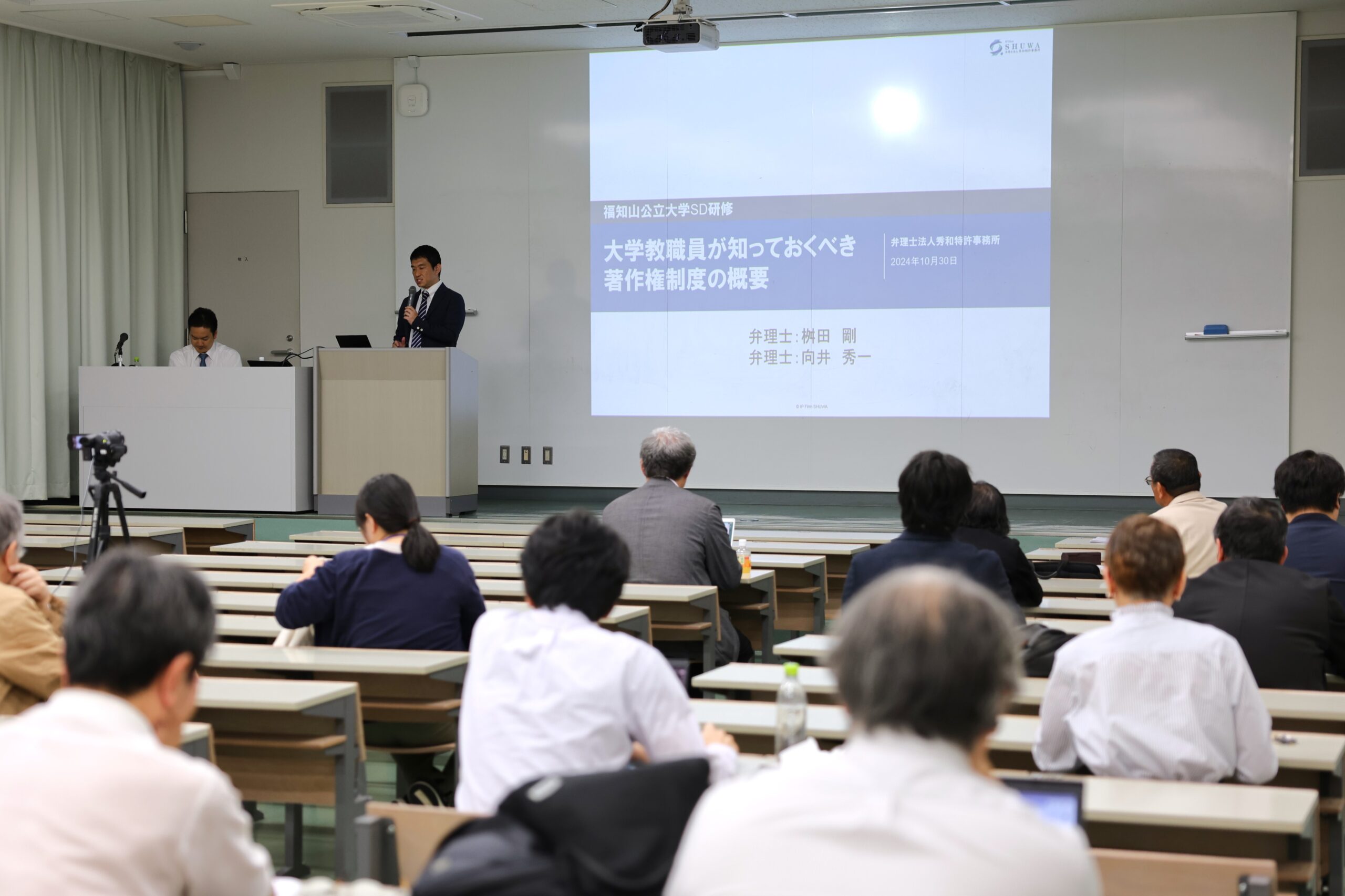 研修会には、弁理士法人秀和特許事務所の桝田剛氏、向井秀一氏をお招きし、「大学教職員が知っておくべき著作権制度の概要」をテーマに、著作権制度の意義、著作物、著作者、著作者の権利や制限等についてご紹介いただきました。