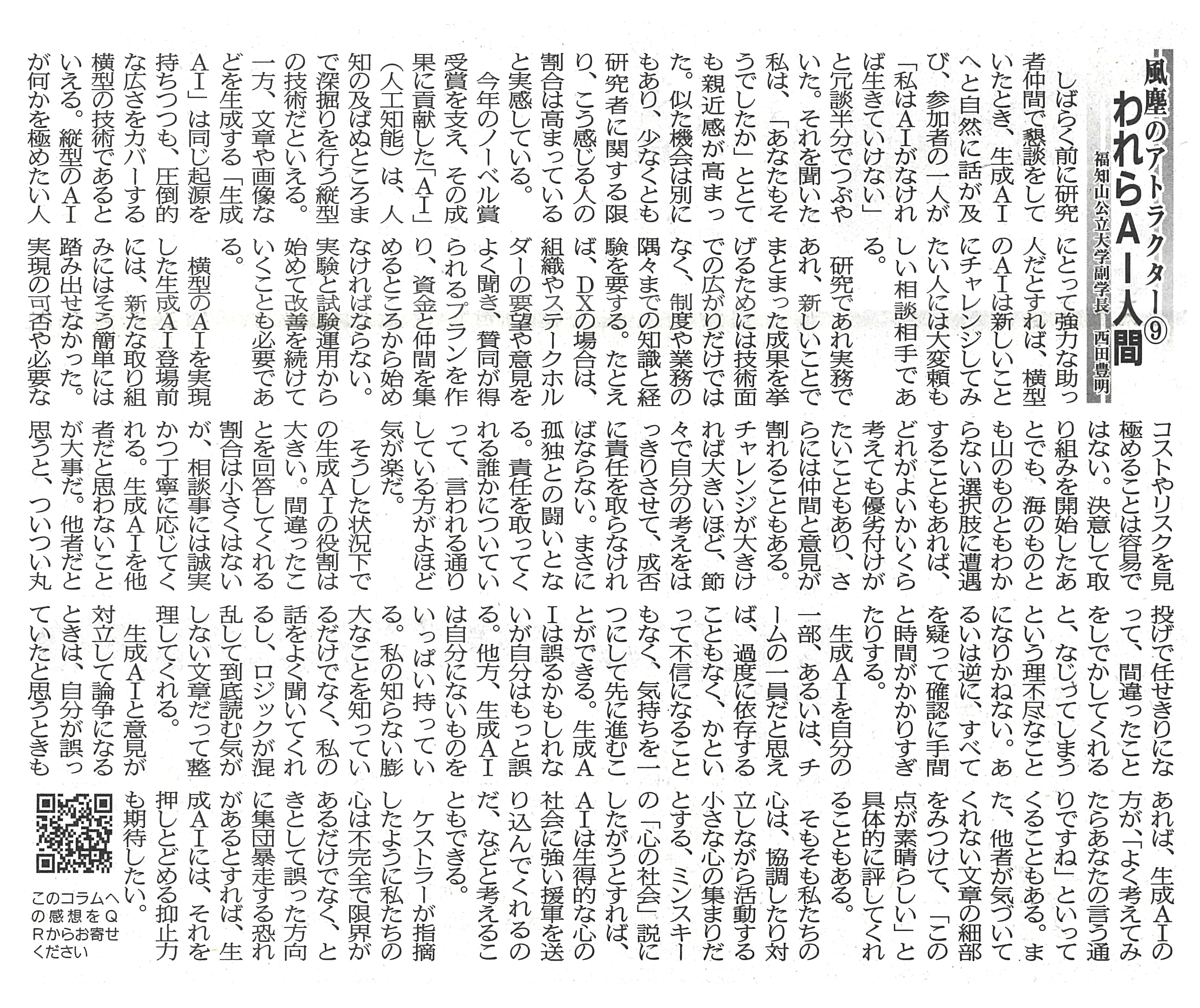 両丹日日新聞に西田副学長のコラムが掲載されました レポート 2024.11.06 両丹日日新聞(2024年11月5日付)に西田副学長が寄稿したコラム「風塵のアトラクター⑨ われらAI人間」が掲載されました。 (両丹日日新聞社提供・無断複製及び転載を禁じます) 前回の記事はこちら ツイート