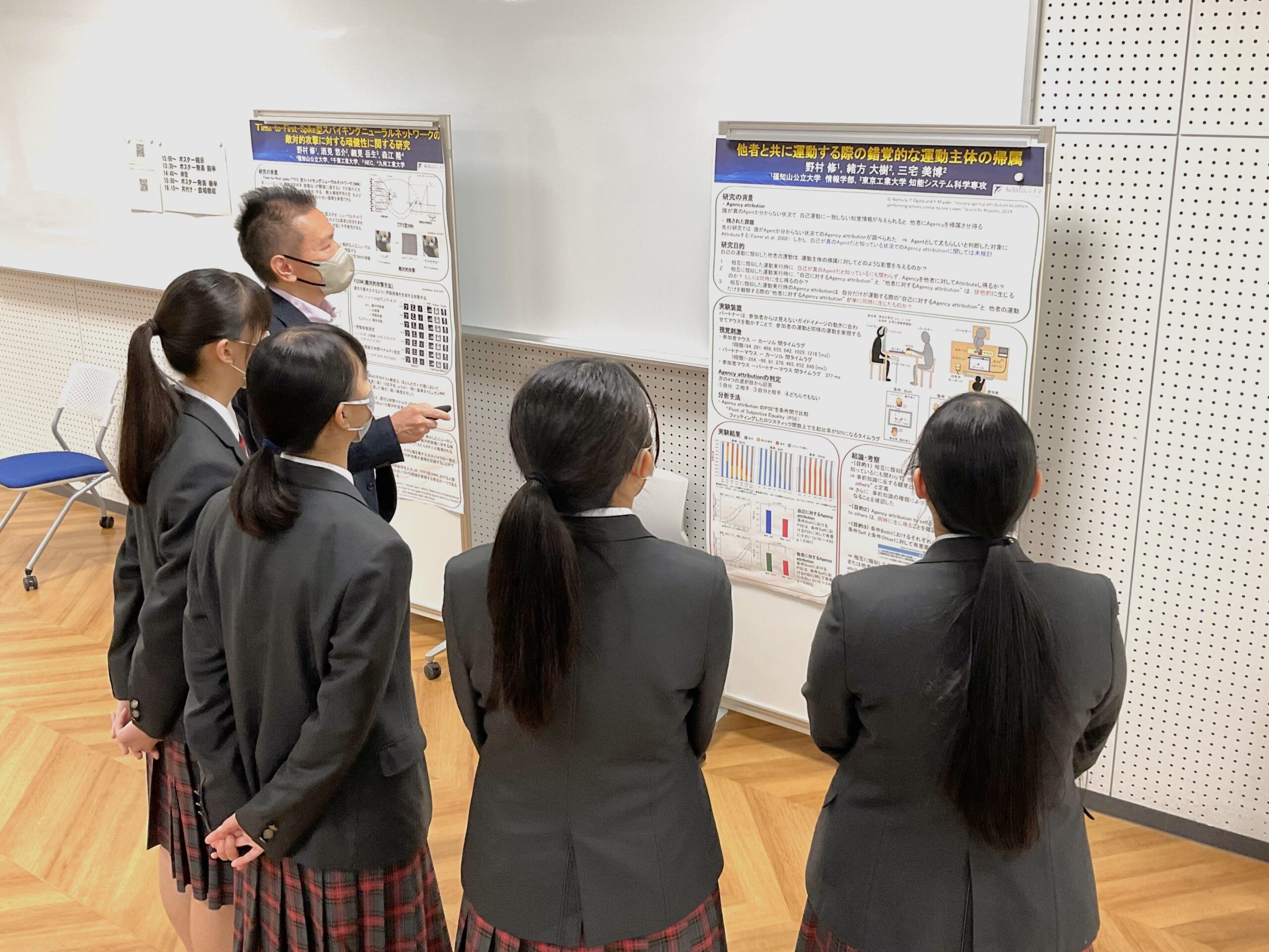 本学からは、情報学部の教員5人と学生16人が参加し、ゼミで取り組む研究の発表や高校生が行うポスター発表へのアドバイスなどの交流を行いました。