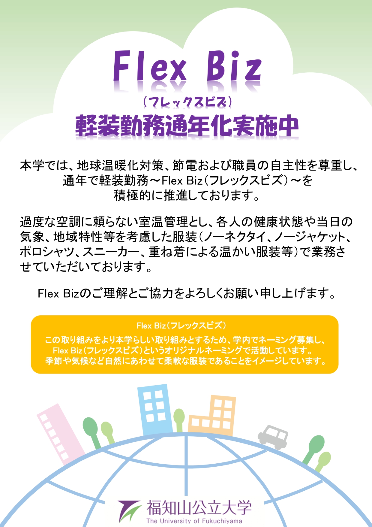 「Flex Biz」とは、地球温暖化対策および節電を目的としており、場の妥当性(TPO)を考慮した上で、各人の健康状態や当日の気象、地域特性等を考慮した服装(ノーネクタイ、ノージャケット、ポロシャツ、スニーカー、重ね着による温かい服装等)で勤務することを推奨する、本学独自の取り組みです。本学ではこれまで夏季限定で「クールビズ」、冬季限定で「ウォームビズ」を実施してまいりましたが、環境への配慮と働きやすい職場づくりの観点から、通年での取組みとして新たにスタートしてまいります。