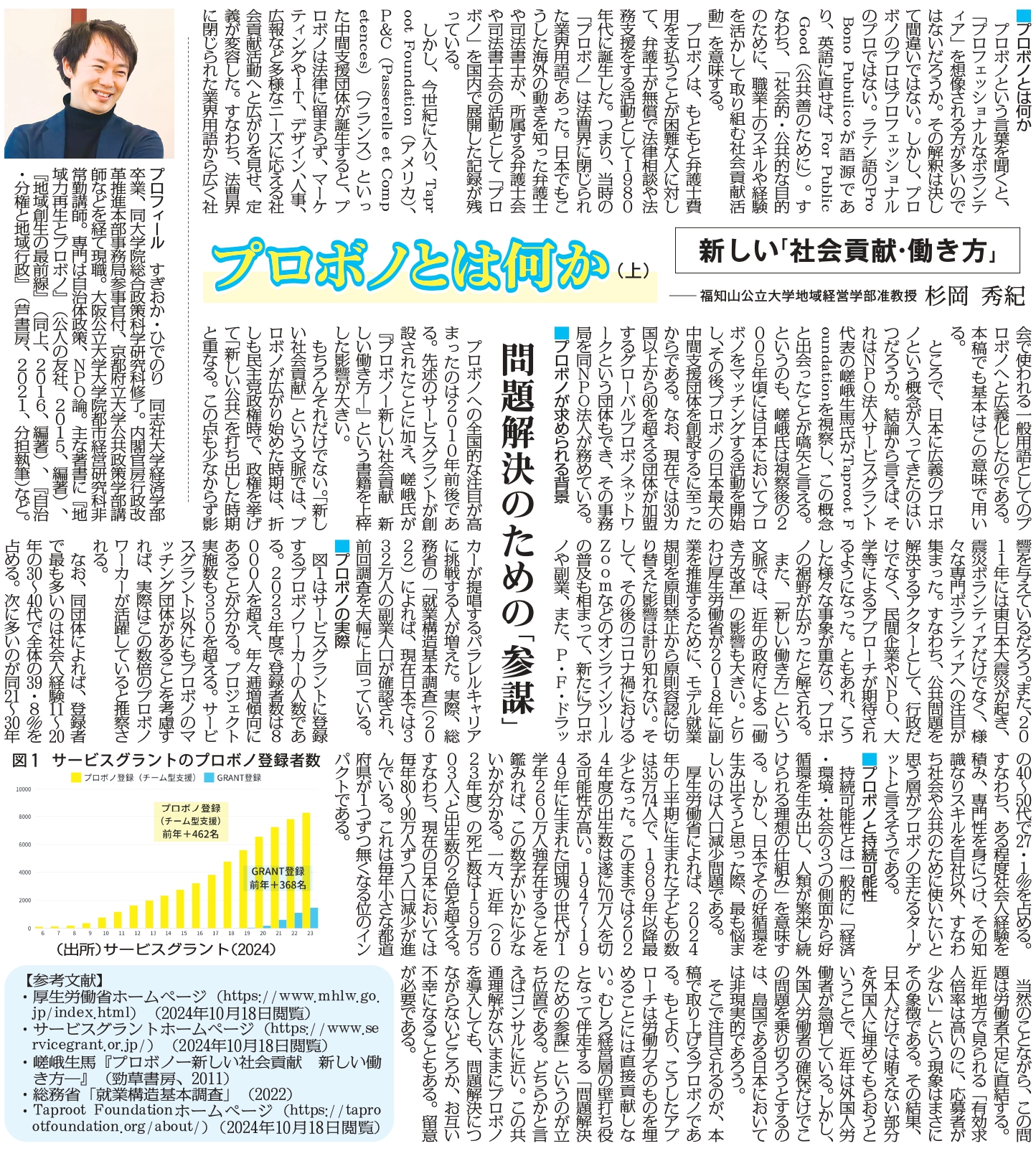 生産性新聞(2024年11月15日付)に、地域経営学部・杉岡秀紀准教授が寄稿した記事「プロボノとは何か(上)」が掲載されました。