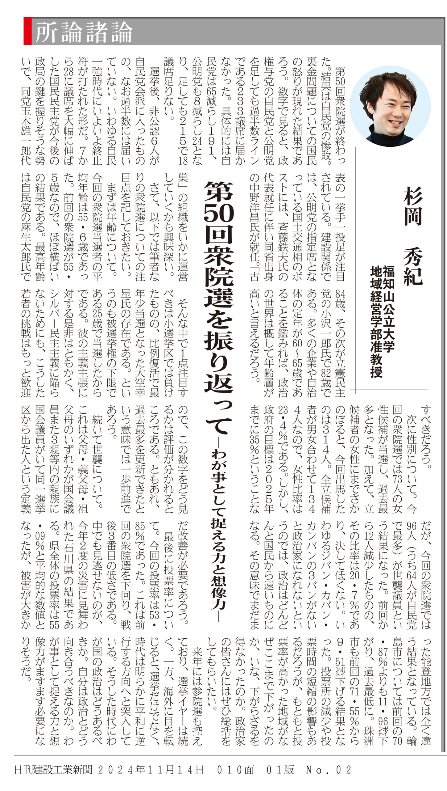 日刊建設工業新聞「所論諸論」に杉岡准教授が寄稿しました レポート 2024.11.15 日刊建設工業新聞「所論諸論」(2024年11月14日付け)に、地域経営学部・杉岡秀紀准教授が寄稿しました。 (日刊建設工業新聞社提供) 前回の記事はこちら ツイート