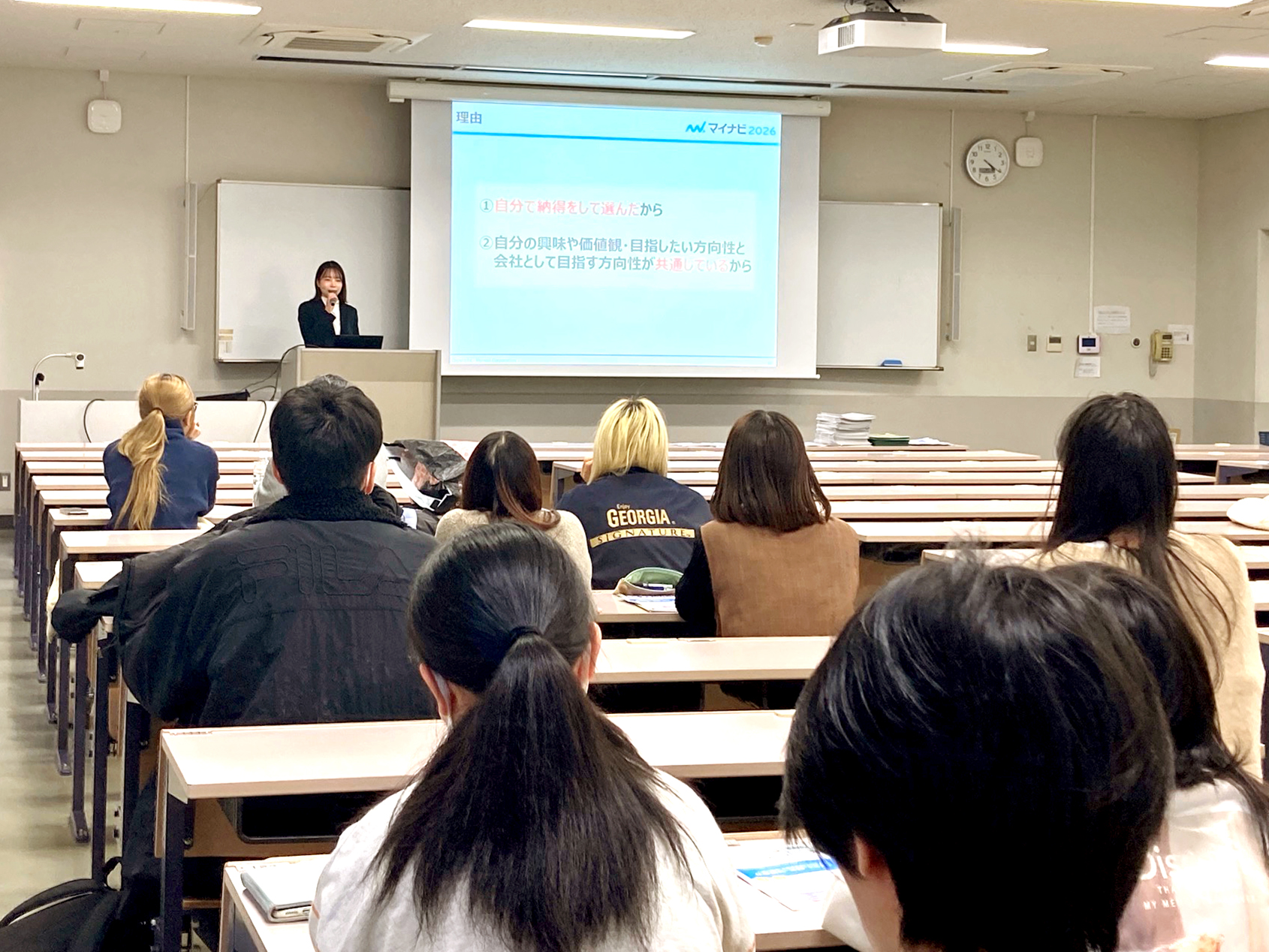 地域経営学部のセミナーでは、視野を広げて選択肢を増やすことが自分の可能性を広げることにつながる点や、様々な業界・企業に触れて比較することの重要性を説明いただきました。また、情報学部のセミナーでは、終盤に実際の企業インターンシッププログラムにエントリーをした学生もおり、今後の就職活動に向けた第一歩を後押しする有意義な機会となりました。
