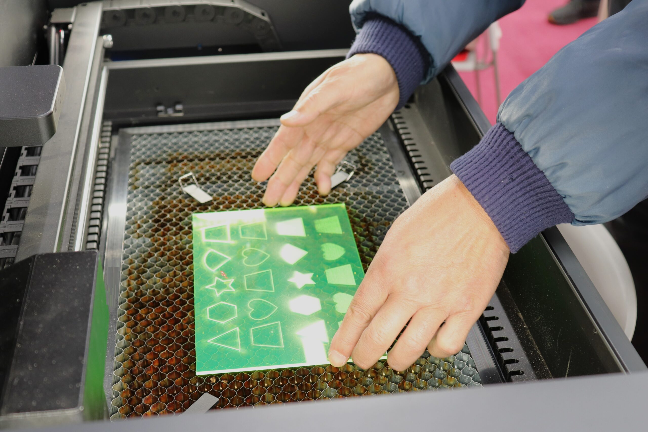 参加者は、メモを取りながら製作物のイメージを膨らませた後、各自のパソコンに専用ソフトをダウンロードし、簡単な図形を作図しました。その後、学生スタッフのサポートを受けながらレーザーカッターを操作し、実際に加工を体験しました。カットや彫刻が瞬時に行われる様子に、参加者は興味深そうに見入っていました。
