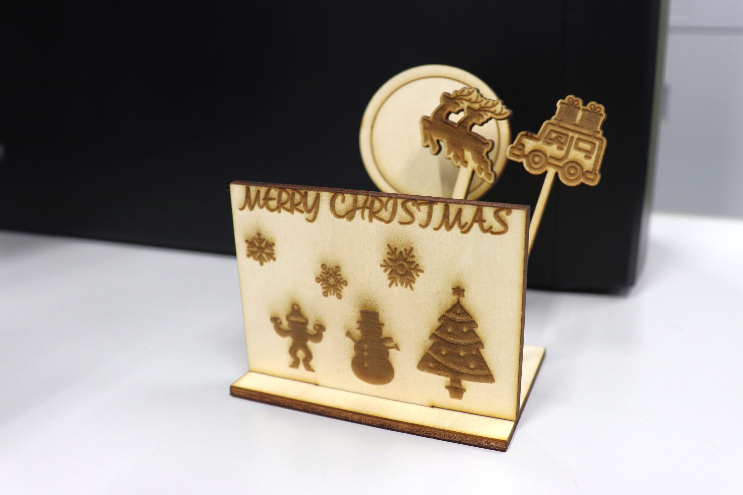 午後は「2.作図・加工演習」として、午前中に学んだ内容を基に、各自で図形やパーツを作図し、加工用のパソコンに登録後、レーザーカッターで実際に加工を行いました。手のひらサイズのキーホルダーやクリスマスのオブジェ、オリジナルのウッドパズルなど、個性豊かな作品が数分で完成しました。