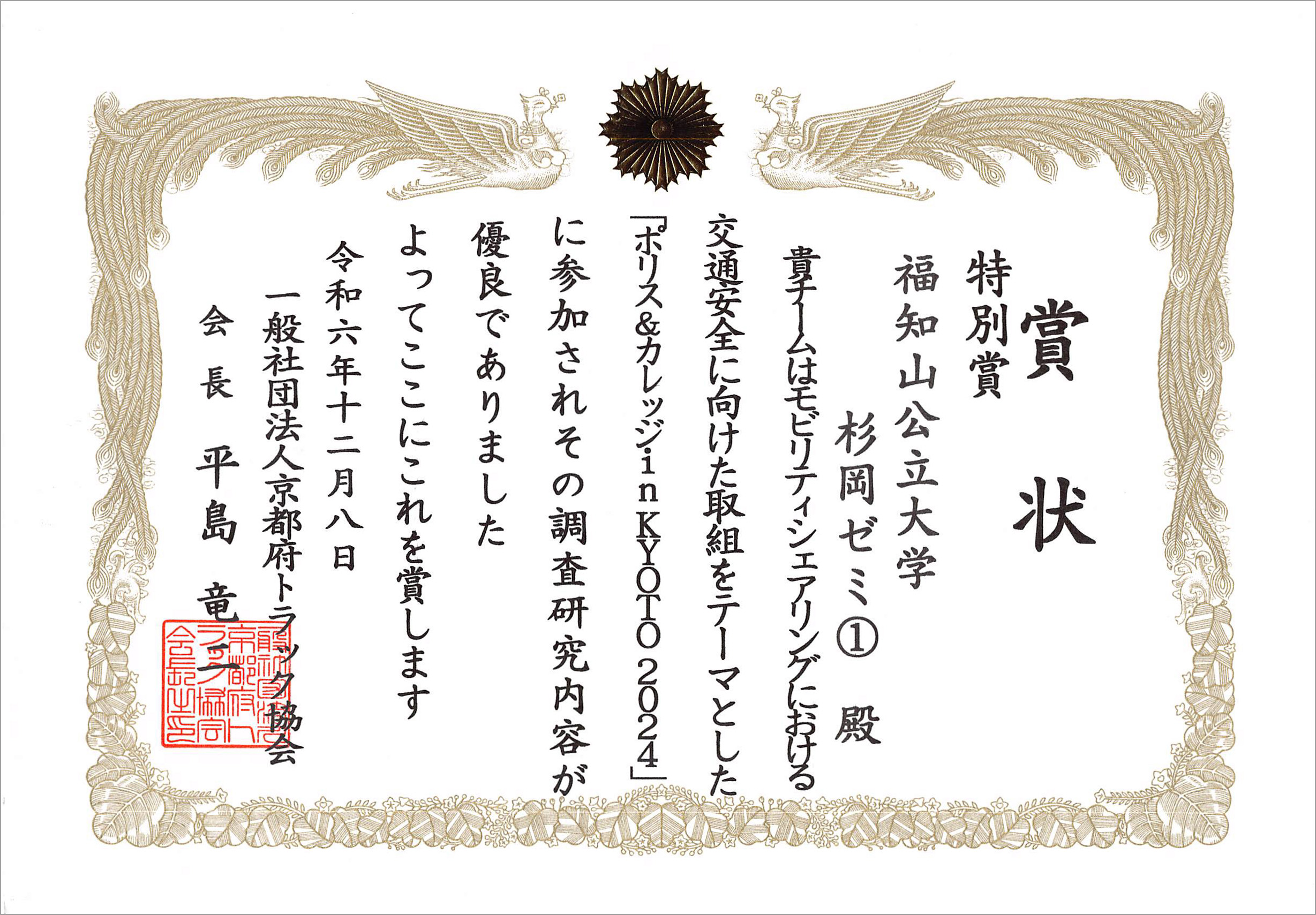 2024年12月8日(日)、第7回大学ゼミ対抗プロジェクト「ポリス&カレッジ in KYOTO 2024」研究発表会(主催:京都府警察本部)が京都府警察学校(京都市)で開催され、地域経営学部・杉岡秀紀准教授のゼミ(2年生チーム、3年生チーム)が出場し、3年生チームが特別賞を受賞しました。