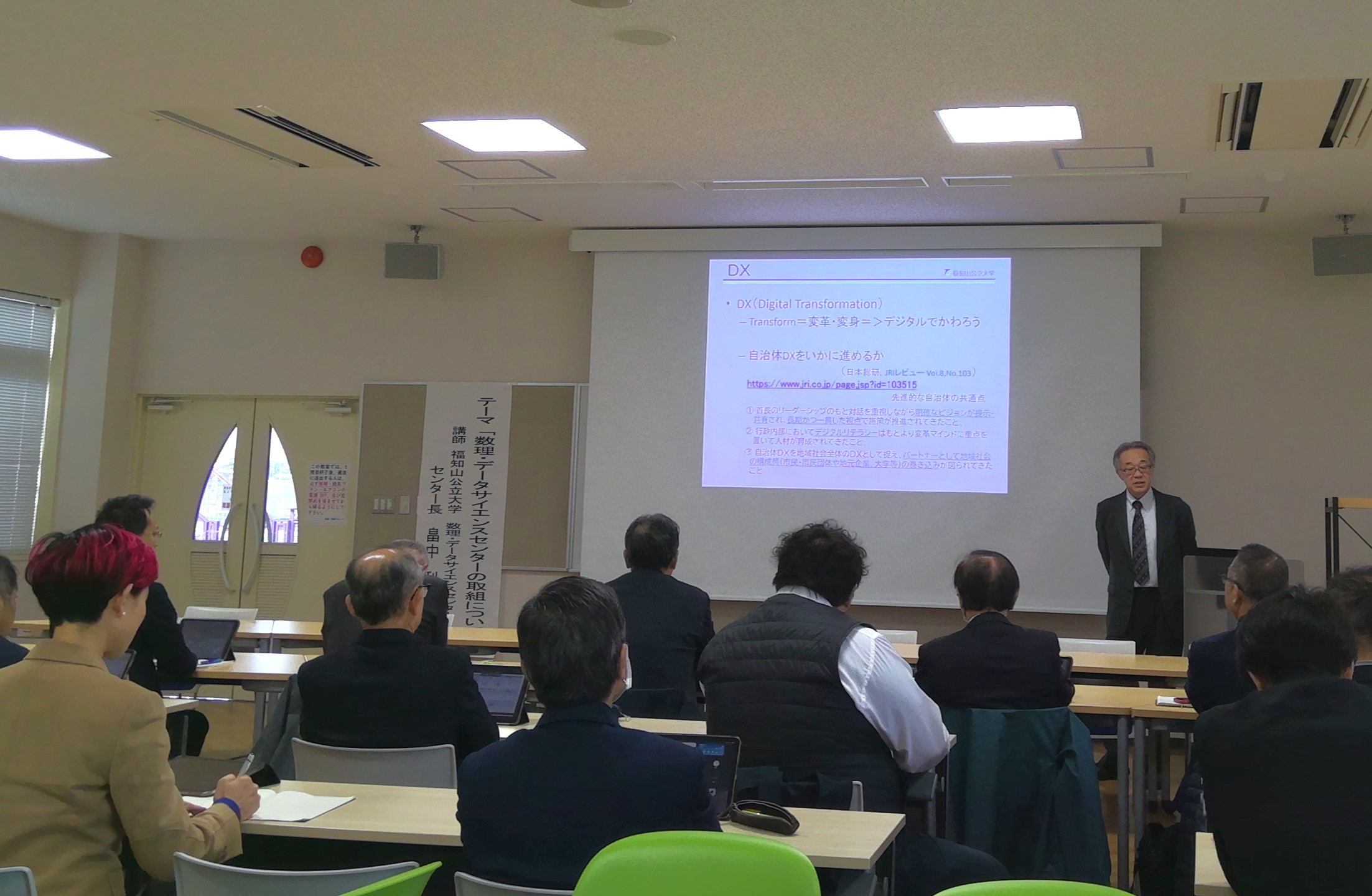 研修会では、まず情報学部の畠中利治教授が登壇し、本学附属機関「数理・データサイエンスセンター」の紹介として、データサイエンスの歴史や教育の動向、本学における教育プログラムの紹介、センターでの活動、学内での連携に関する説明が行われました。