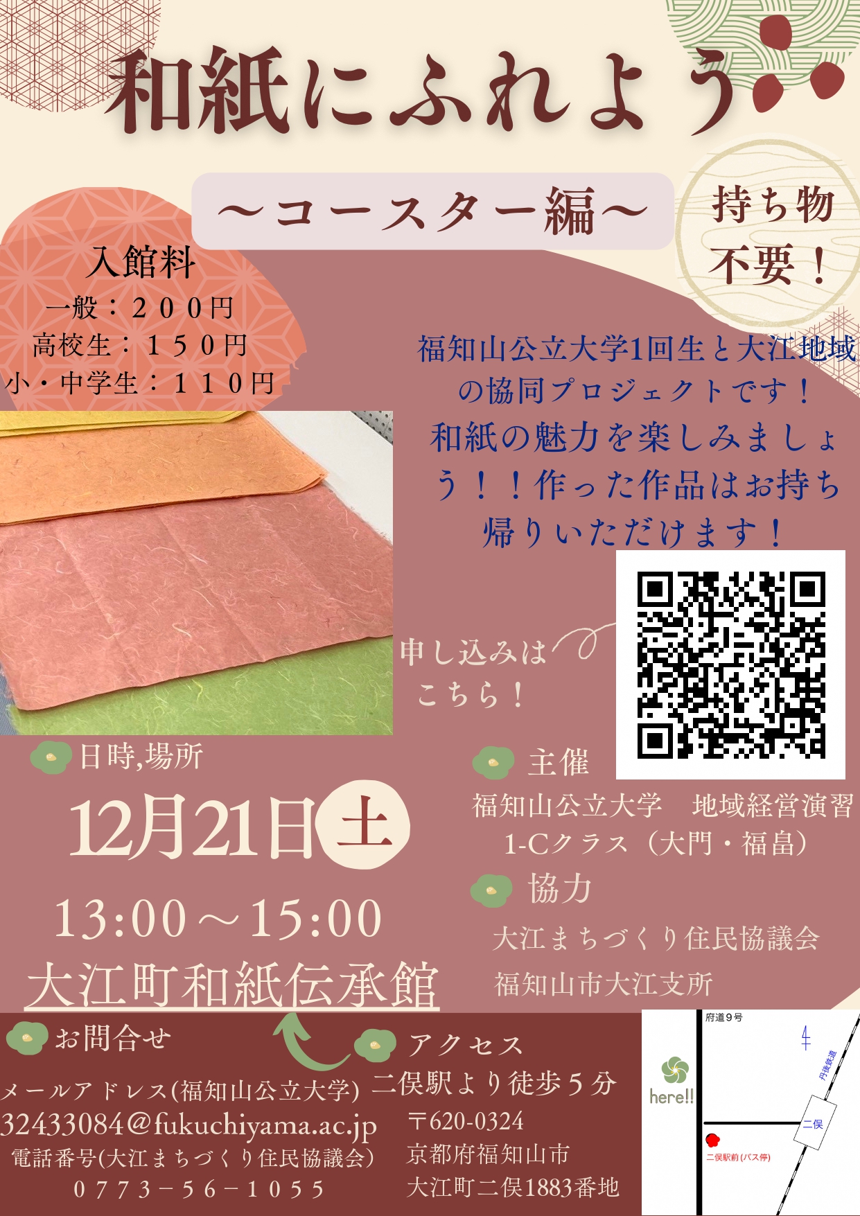 和紙のワークショップ参加申し込みフォーム 福知山公立大学地域経営演習 1−Cクラス(大門・福畠)<外部リンク>