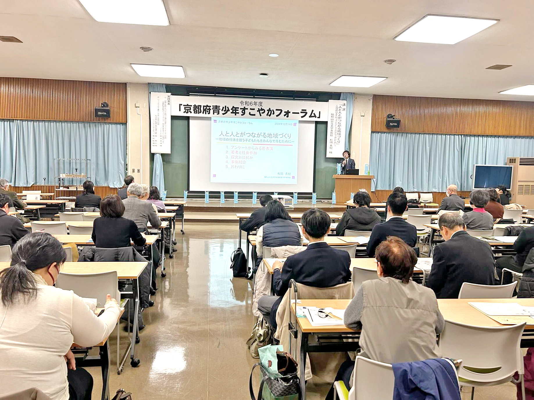 このフォーラムは、京都府と京都府青少年育成協会が主催し、青少年育成市町村会議、青少年育成団体、PTA、地域団体、学校などを対象に毎年1回実施しているもので、今年度は約70名が参加しました。