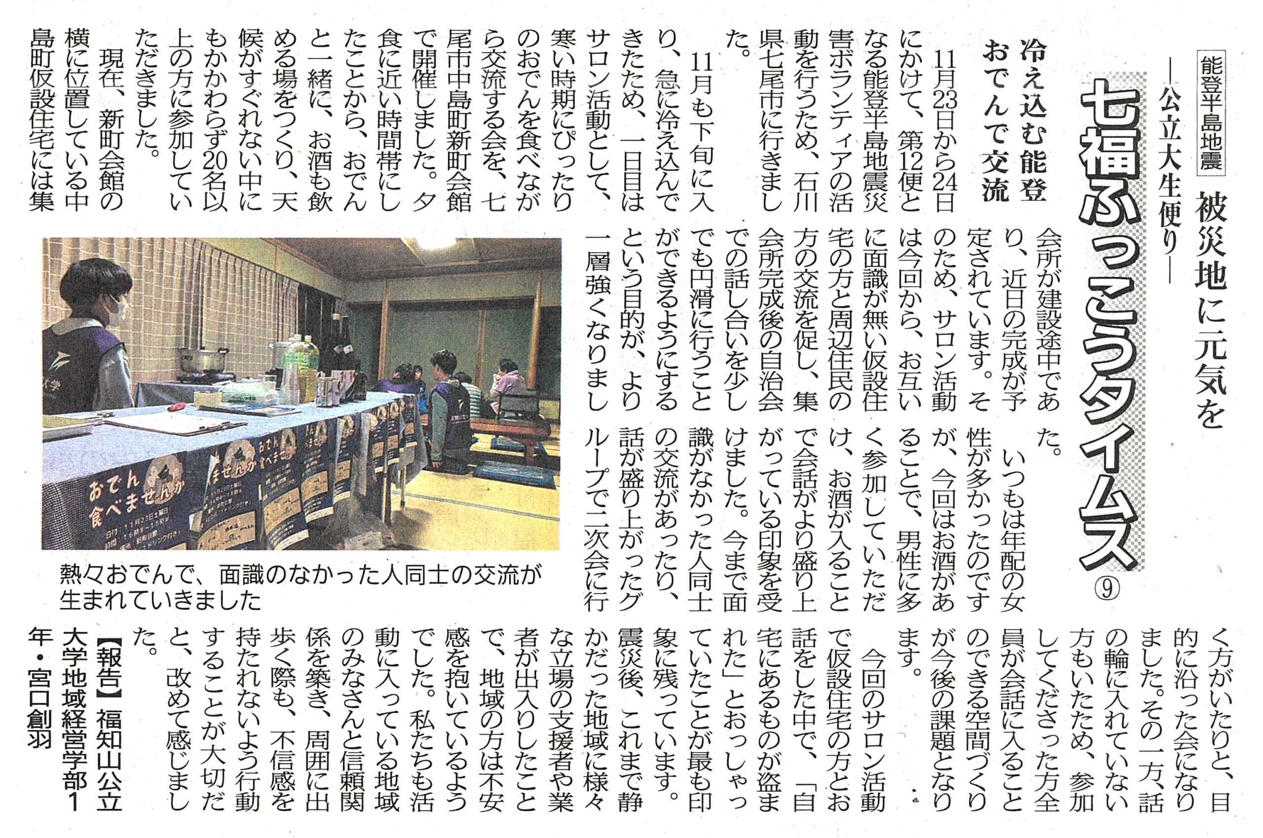 両丹日日新聞に本学公認団体「七福ふっこう隊」の連載記事『七福ふっこうタイムス』が掲載されました レポート 2024.12.16 両丹日日新聞(2024年12月12日付け)に、本学公認団体「七福ふっこう隊」が被災地支援の様子を記す『七福ふっこうタイムス⑨』が掲載されました。 (両丹日日新聞社提供・無断複製及び転載を禁じます) 前回の記事はこちら ツイート