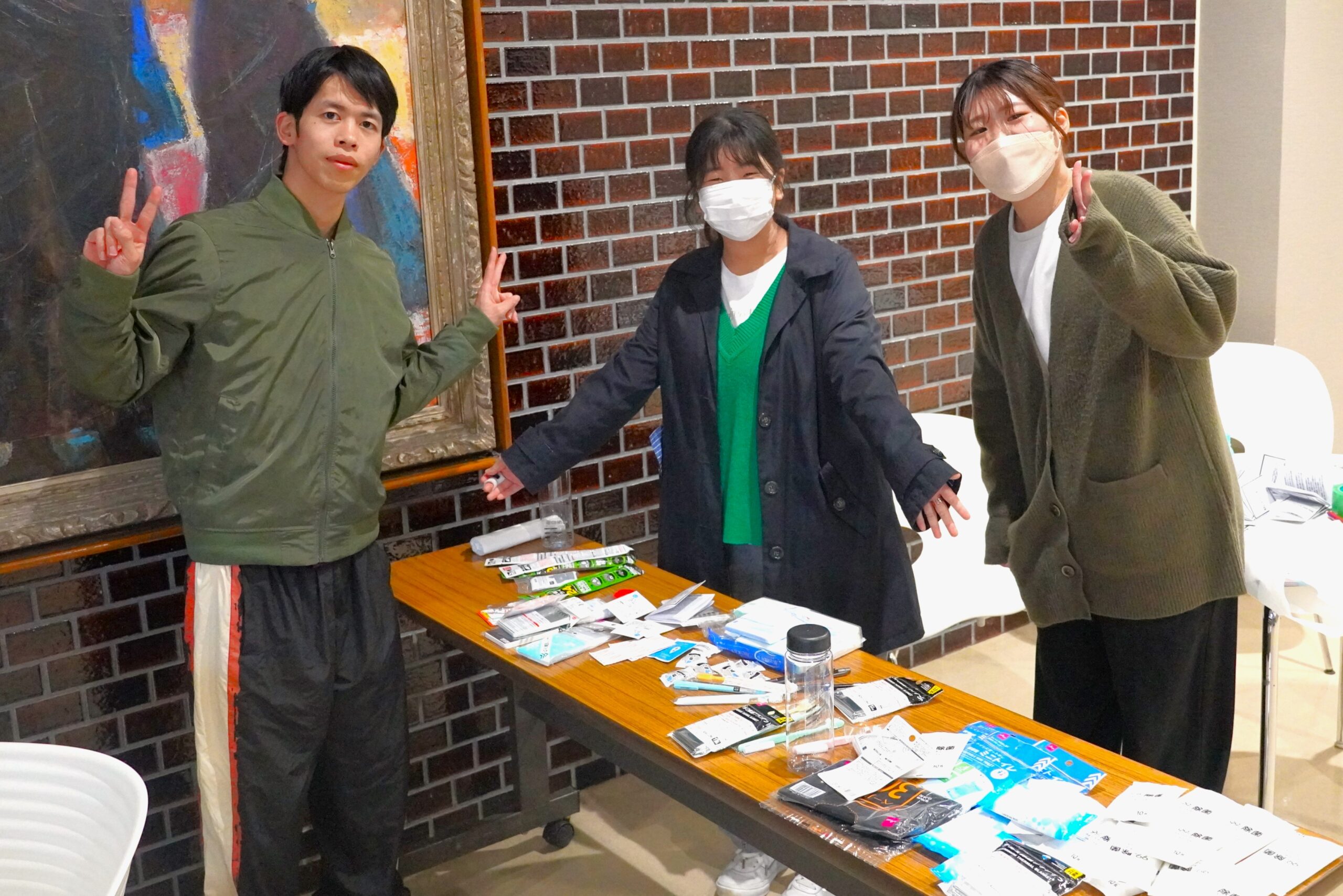 会場では、吹奏楽や軽音などの音楽系サークルの他、演劇サークルによるステージ、STL採択プロジェクト団体によるワークショップ、ポスター展示などが行われ、様々な形でこれまでの成果を発表しました。吹奏楽サークルは「学園天国/小泉今日子」の「ヘーイヘイヘイヘイヘイ」というかけ声で会場を盛り上げ、高校野球大会の入場行進曲にも選ばれた「群青/YOASOBI」を演奏するなど、聞きなじみのある楽曲を披露しました。STL採択プロジェクト団体の「七福ふっこう隊」は、絆創膏や携帯トイレ等を詰め込んだ防災ボトルの制作など、いざという時に使える防災グッズの制作ワークショップを行いました。