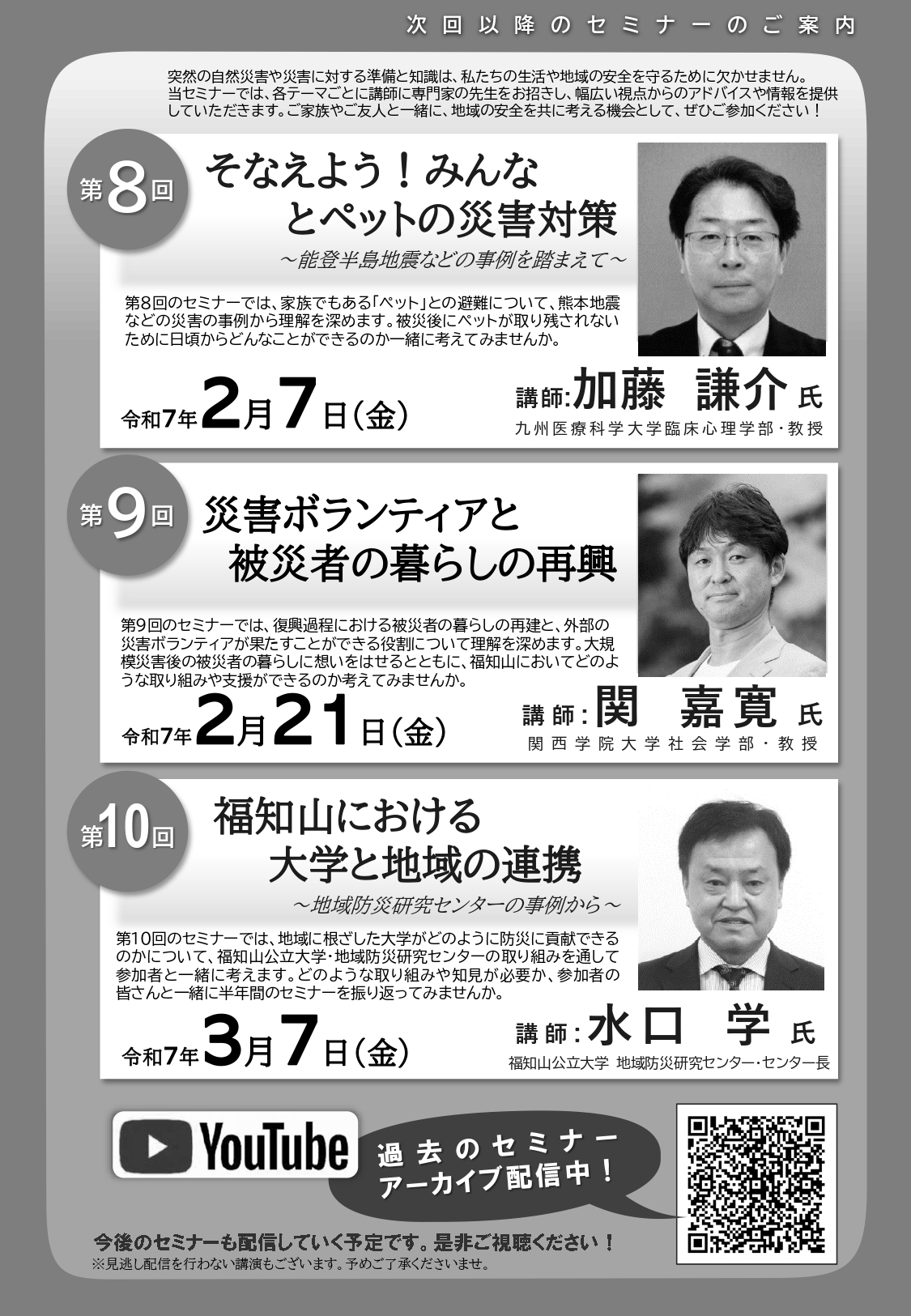 ■内 容:東日本大震災の被災地である岩手県野田村での地域コミュニティの見守り活動から、長期的な復興においてどのような支援が求められるのか理解を深めます。福知山での水害における復旧との対比から、大地震における地域のつながりの意味について考えてみませんか。