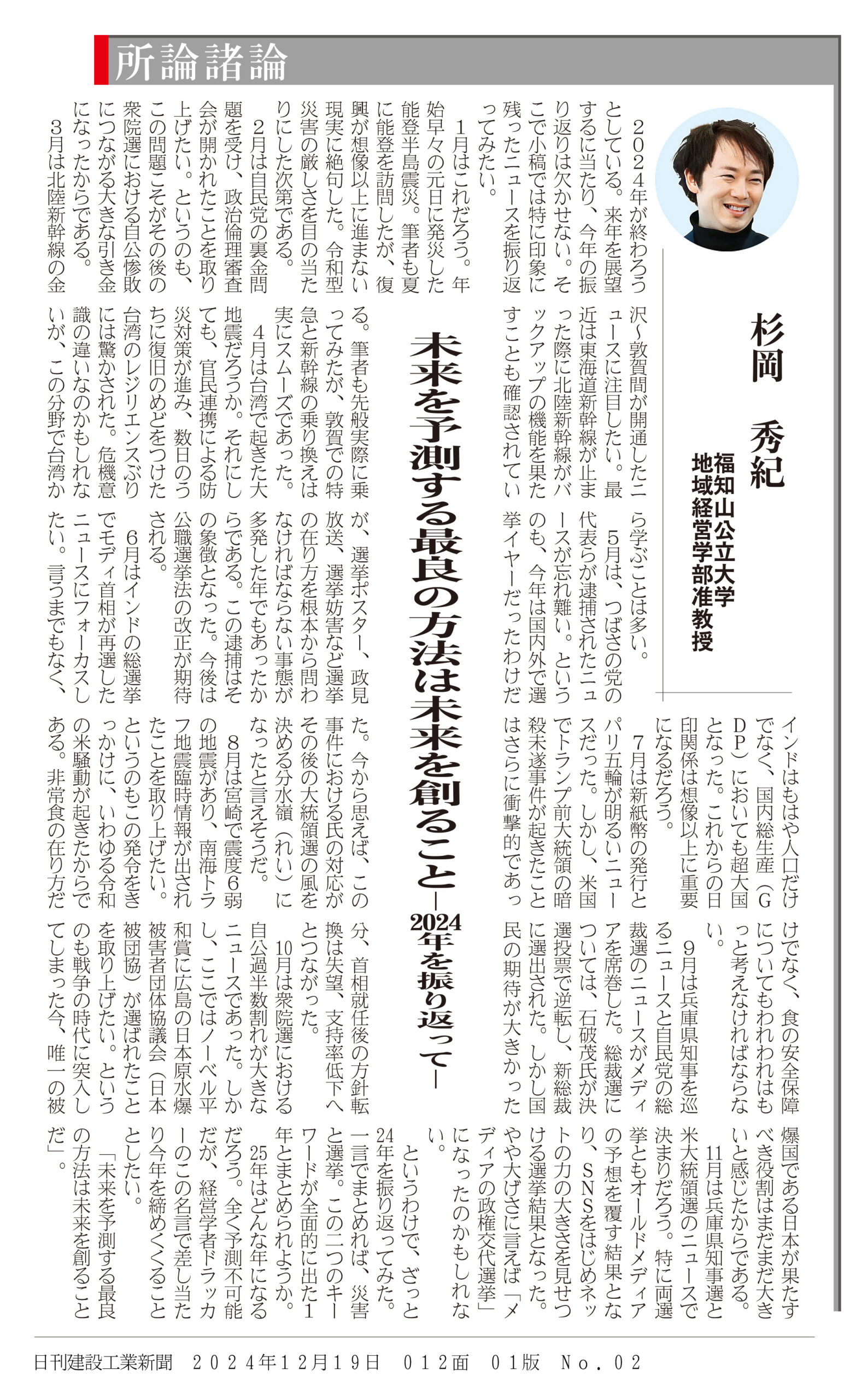 日刊建設工業新聞「所論諸論」に杉岡准教授が寄稿しました レポート 2024.12.20 日刊建設工業新聞「所論諸論」(2024年12月19日付け)に、地域経営学部・杉岡秀紀准教授が寄稿しました。 (日刊建設工業新聞社提供) 前回の記事はこちら ツイート